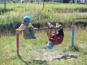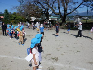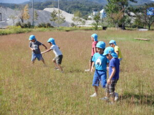 小学校を通ると縄跳びを練習中の小学生。短縄跳びに挑戦中の子ども達は「こんなに飛べるんだ!」「すごい!!」と関心をもって見ていました。