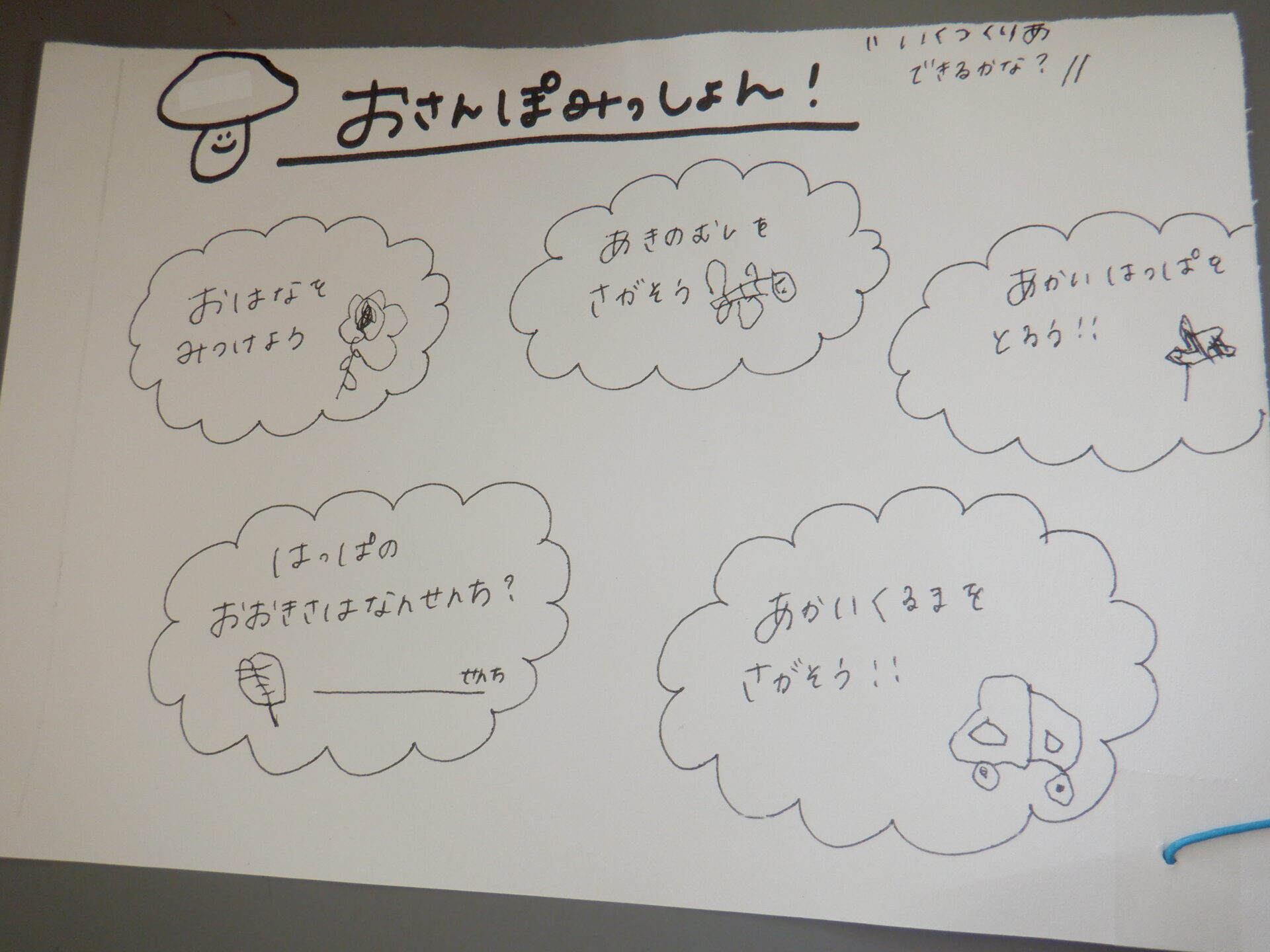 ・秋の自然に関心を持てるように子ども達と考えながらミッションカードを作ってみた。カードがあることでより関心をもって歩くことができた。