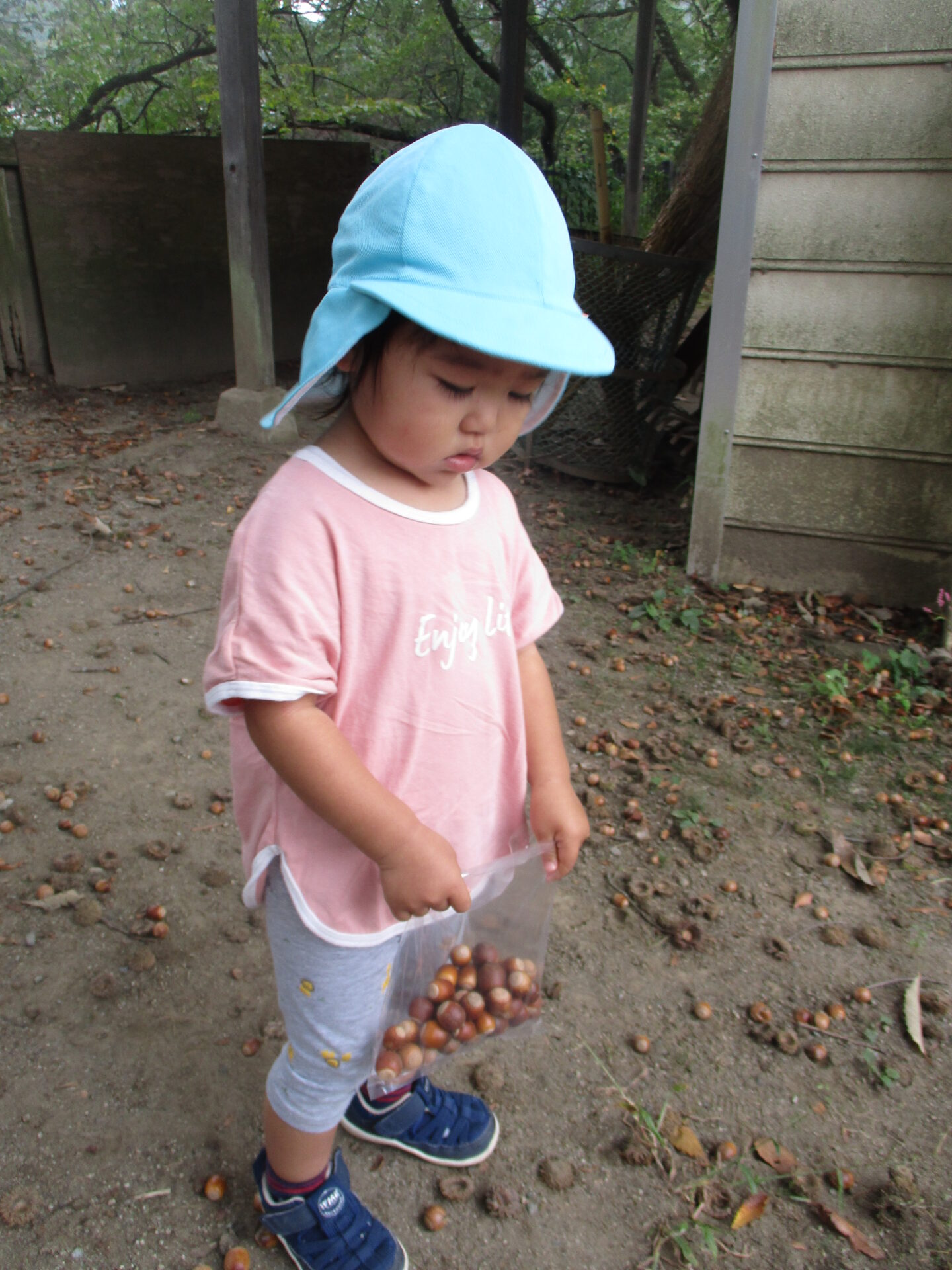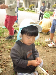 どんぐり拾いに出かけるとどんどん袋に詰める子、形を見て割れていないものを探す子、拾うよりも踏みつけた感覚を楽しむ子と、楽しみ方はそれぞれ!!