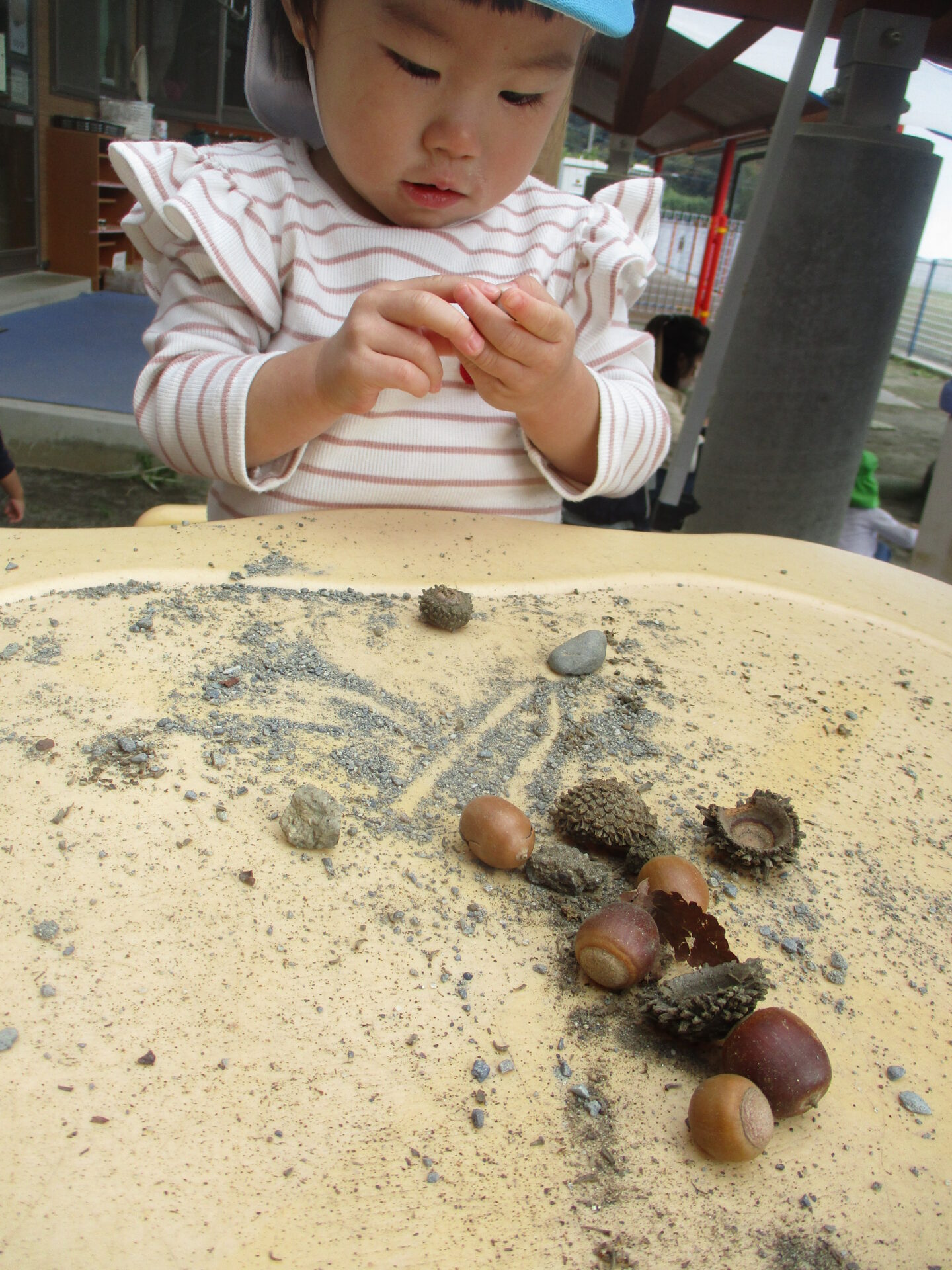 どんぐりを転がしたり、皮をむいてみたり、色々な楽しみ方で楽しんでいます。