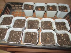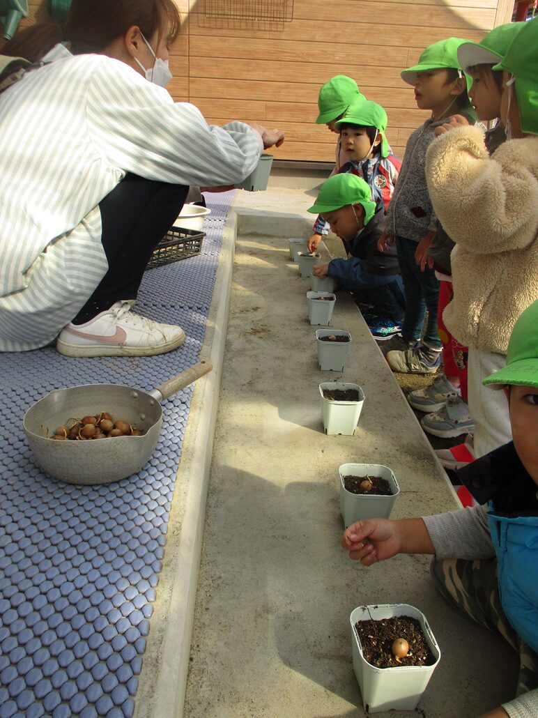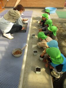 2歳児さんが一人ひとつずつカップの中に蒔きました。