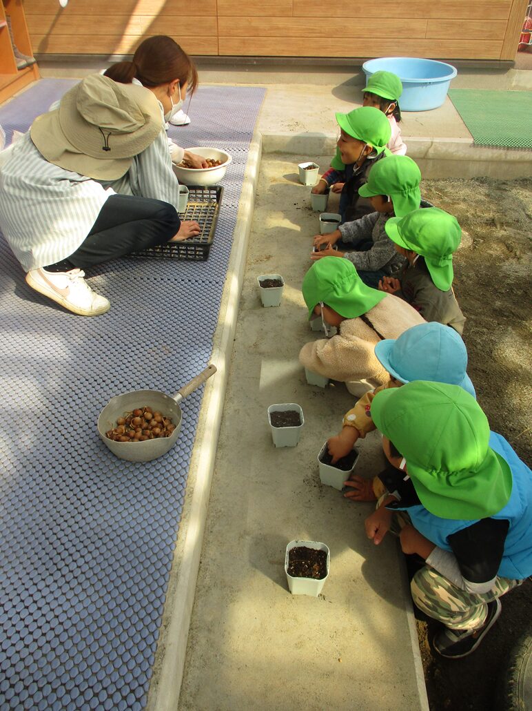 どんぐりの生長を楽しみに土をかける2歳児の姿にやさしさを感じました。