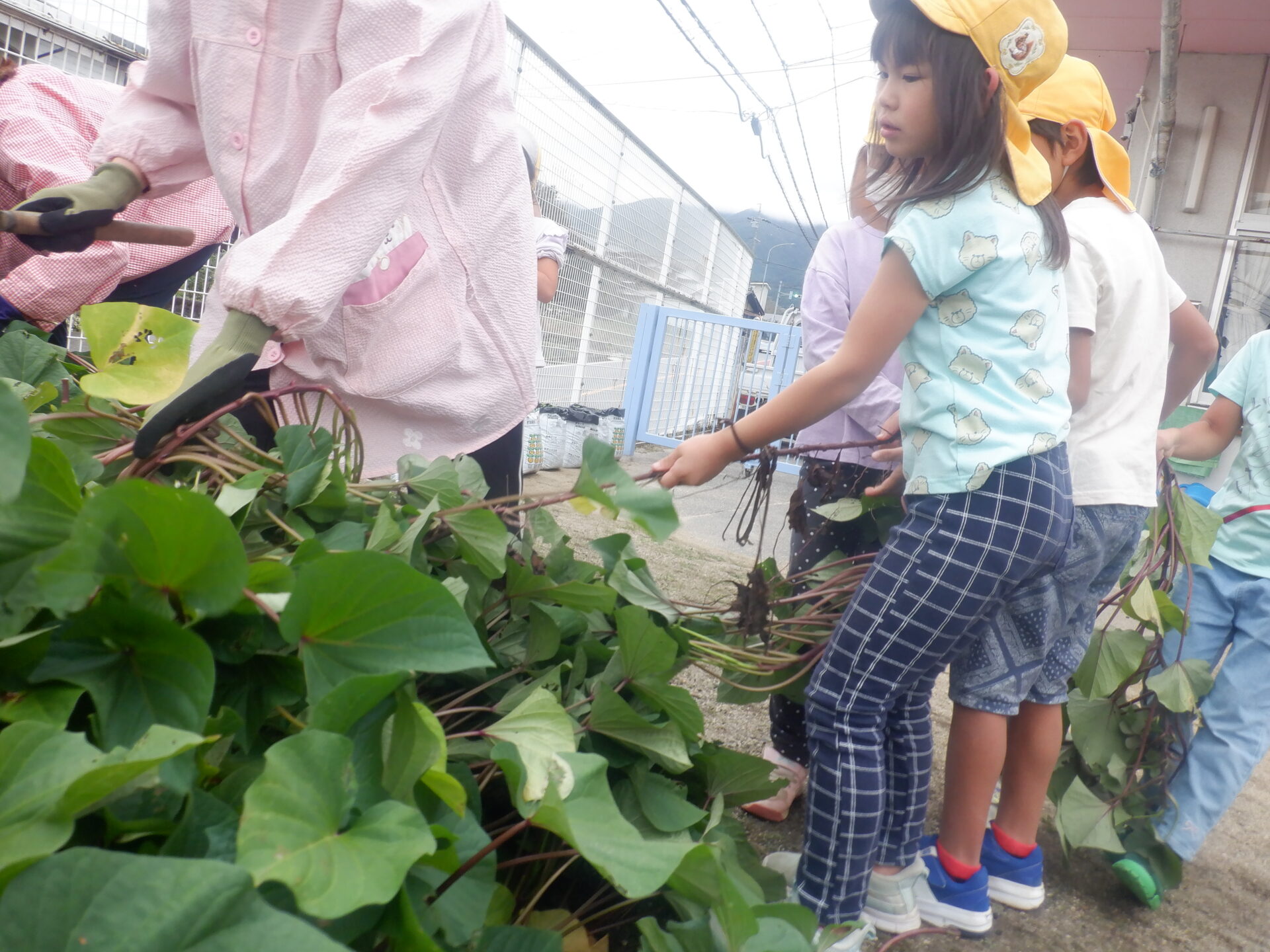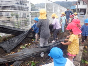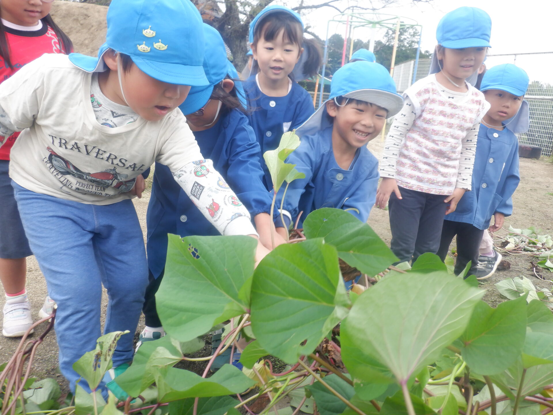 園庭にあるおいもの畑はお芋の葉っぱに覆われて「どこにお芋があるのかなぁ・・・?」