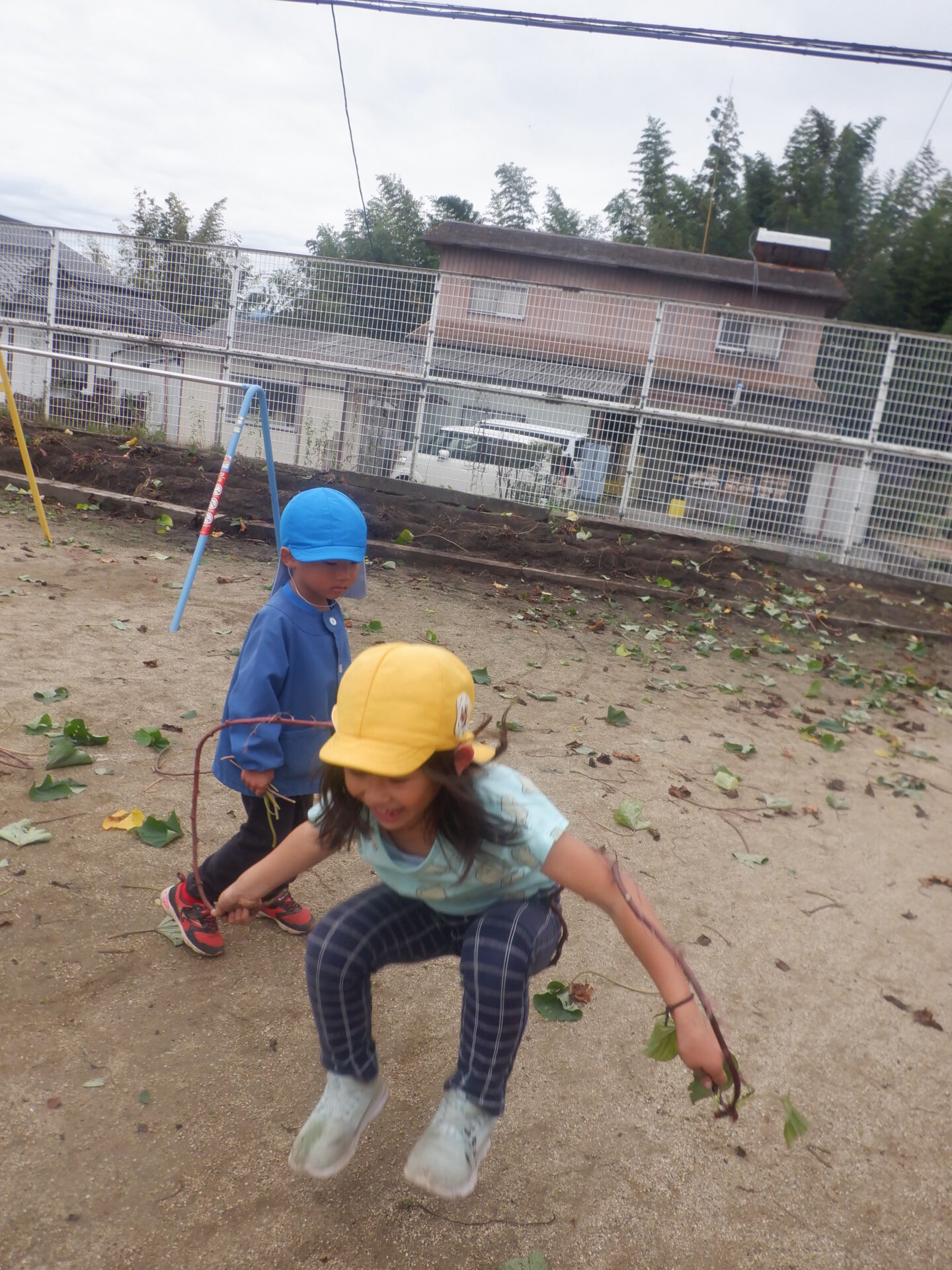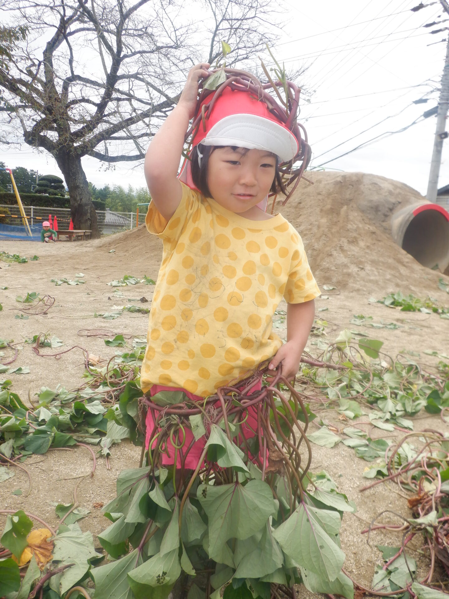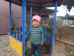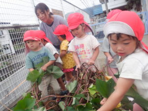 ・今年は園庭でサツマイモ作りをしました。こども達も日々生長の変化を見て、葉っぱがいっぱいになる頃には、お芋掘りを楽しみにしてきました。切ったツルで、こども達は工夫しながら様々な遊びを楽しみました。