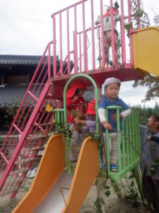 畑がきれいになるとこども達はツルで遊び始めます。