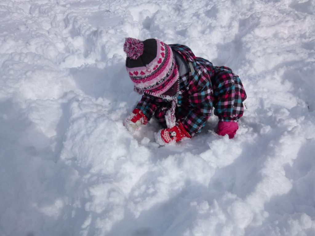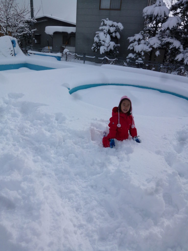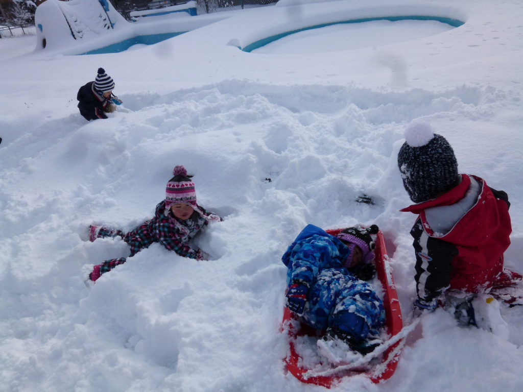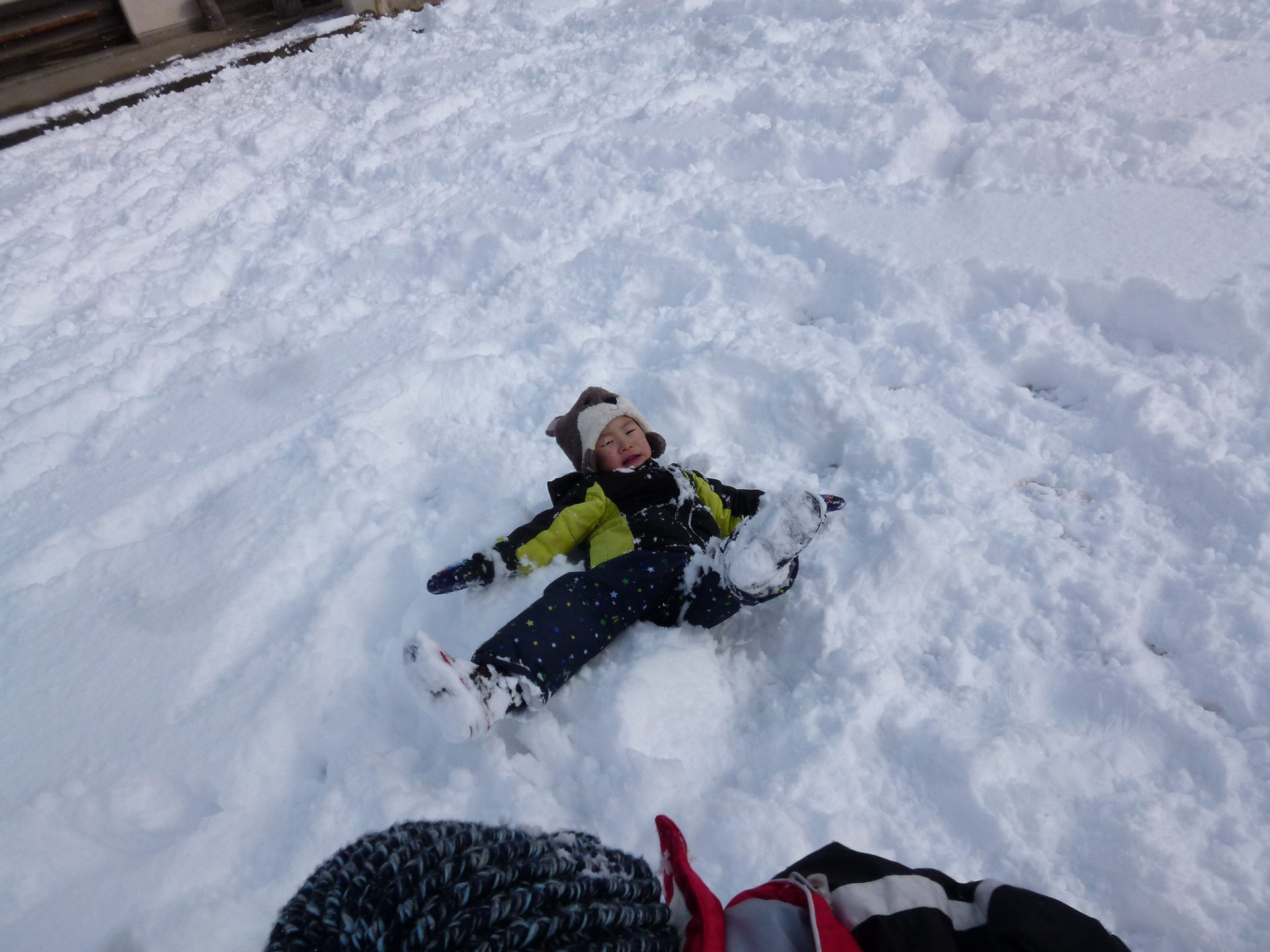 新雪に座ってみたり寝転んでみたり。。「雪のお布団だよ!」とごろごろ転がっていた子ども達です。ふかふかの雪は気持ちいいですよね♪