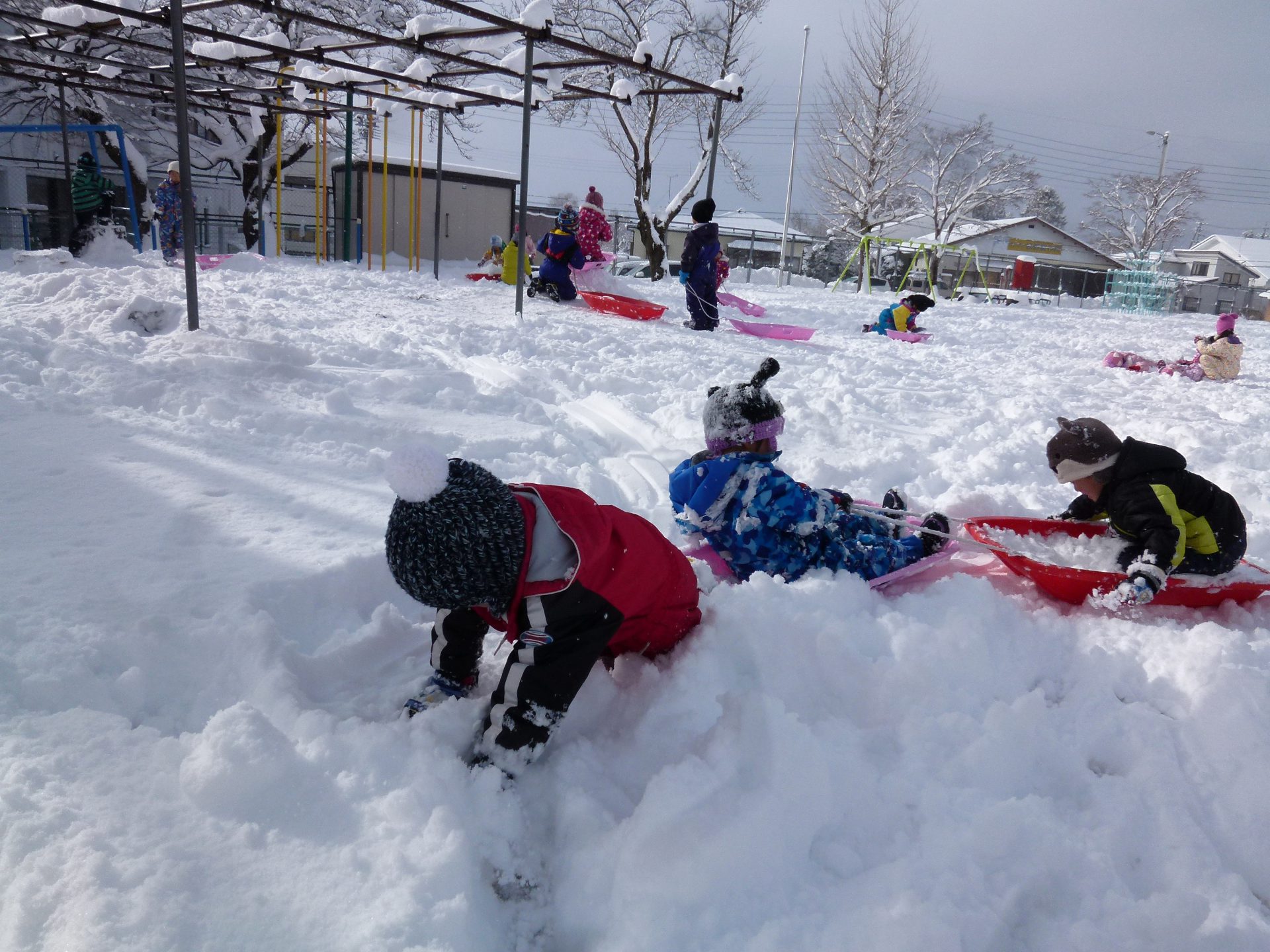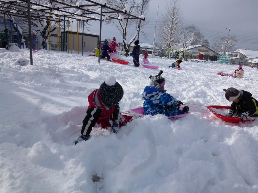 ソリ遊びはもちろん雪合戦も楽しんでいる子ども達。体をいっぱい動かして遊ぶので給食の進みも早く、お昼寝も早い子ども達です。