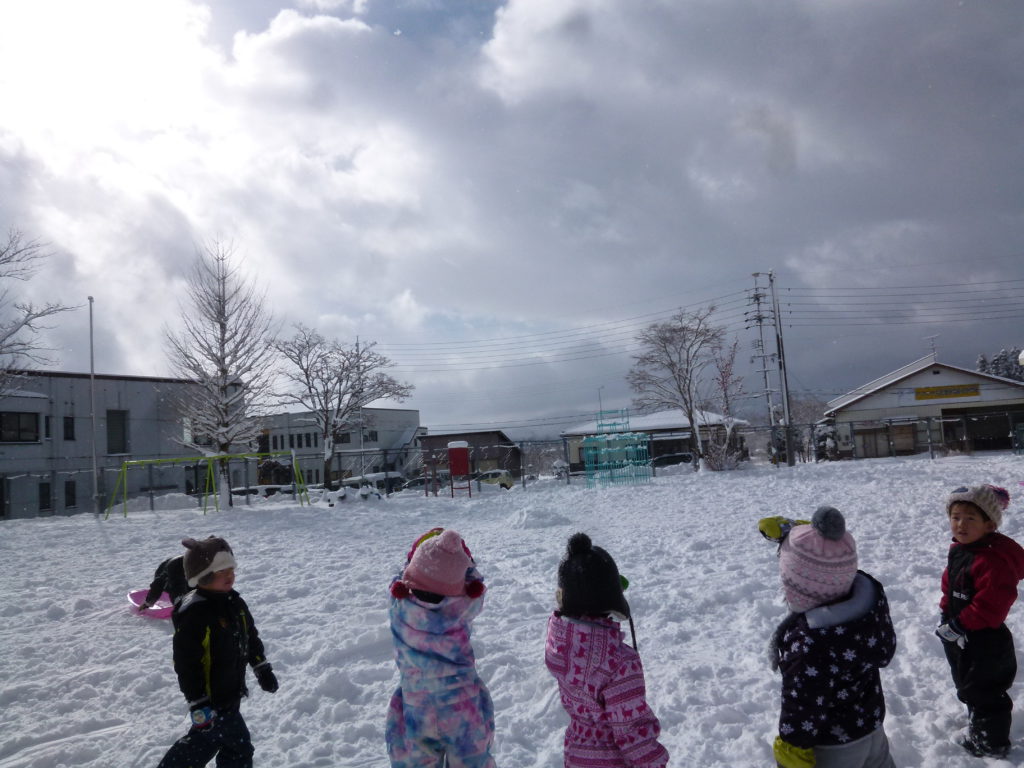 雪遊びをしていると、空に白い鳥がV字隊列で飛んでいくのが見られました。(写真がうまく撮れずお見せできないのが残念ですが、、)本やテレビで見たことはあっても実物を見たことがなかった私は感動しました。子ども達も遠く見えなくなるまでじーっと見つめていました。白い鳥の正体は白鳥かな~?