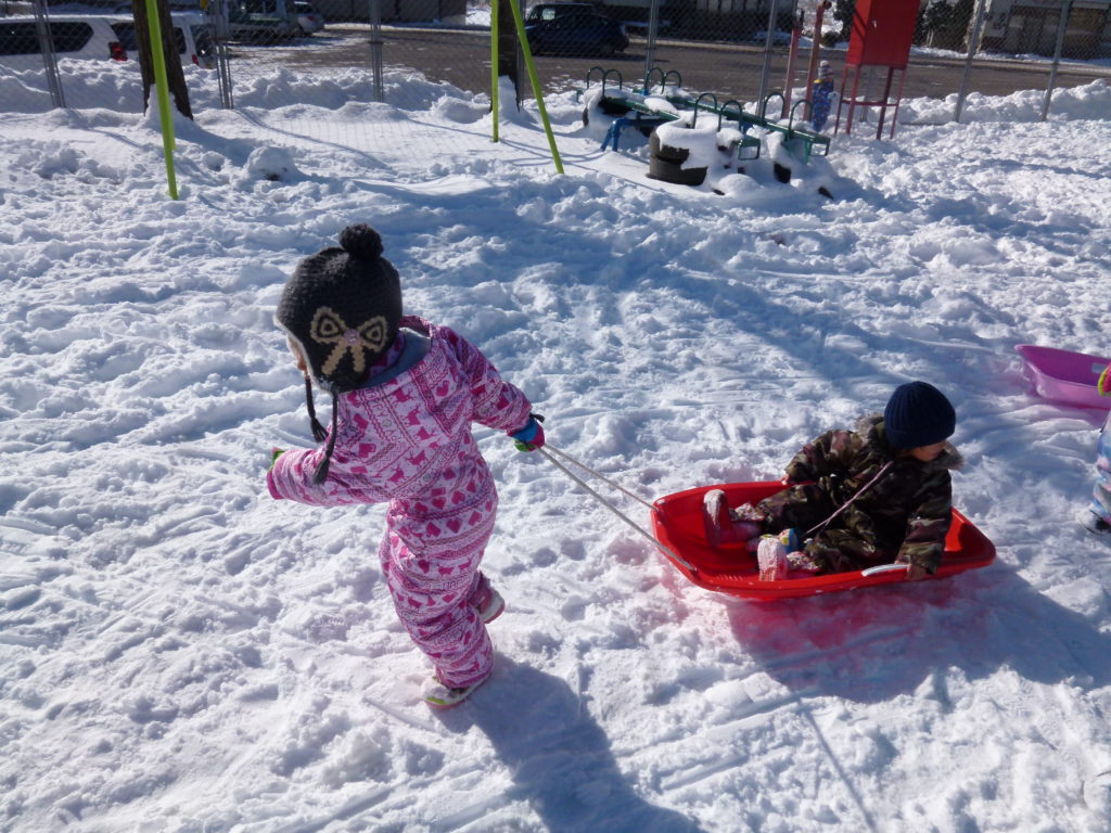 ソリ遊びも子ども達の人気の遊びです。友達を乗せて引っ張っていきます。「どこに行きますか~?」「向こうまでお願いします」タクシーの運転手さんみたいです。