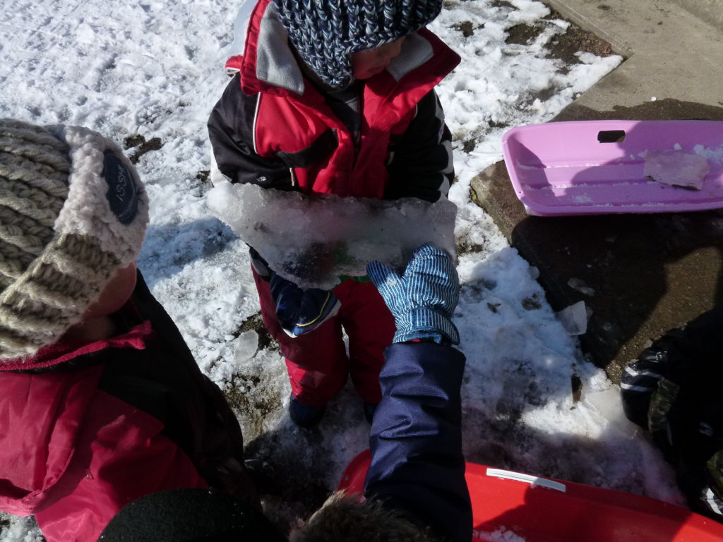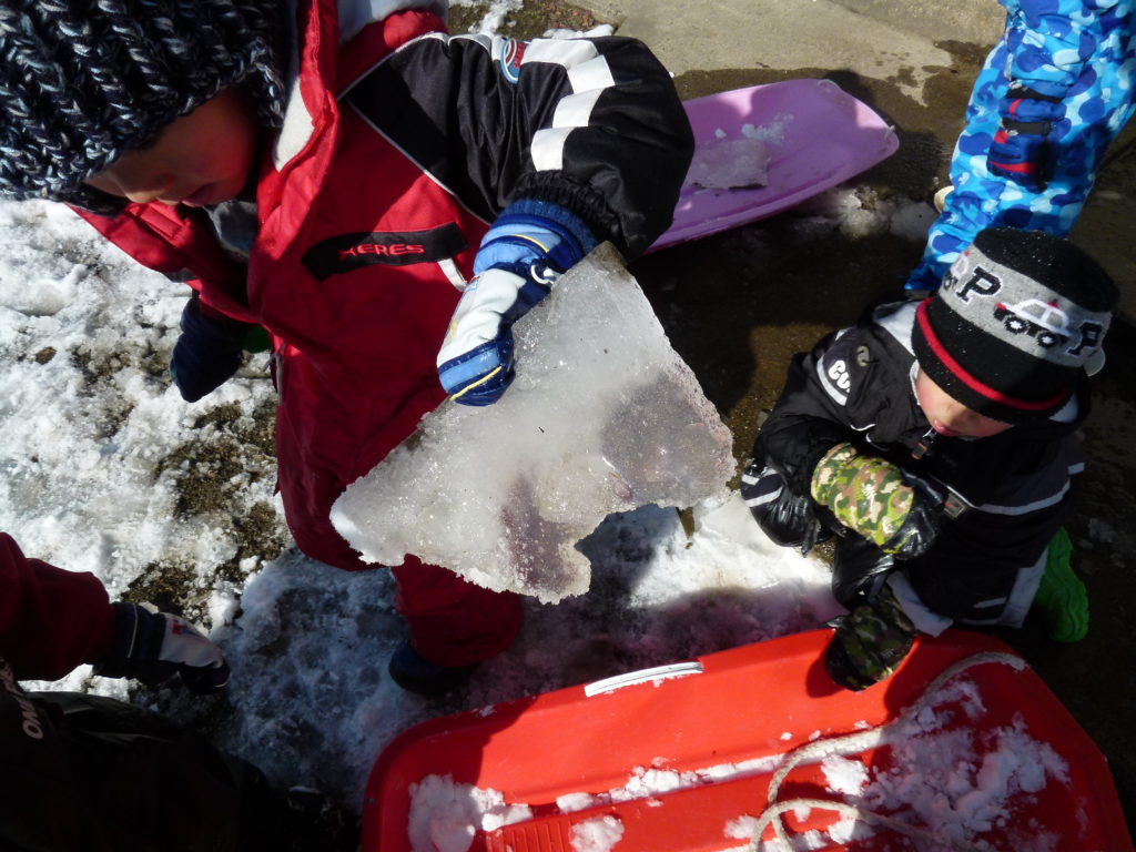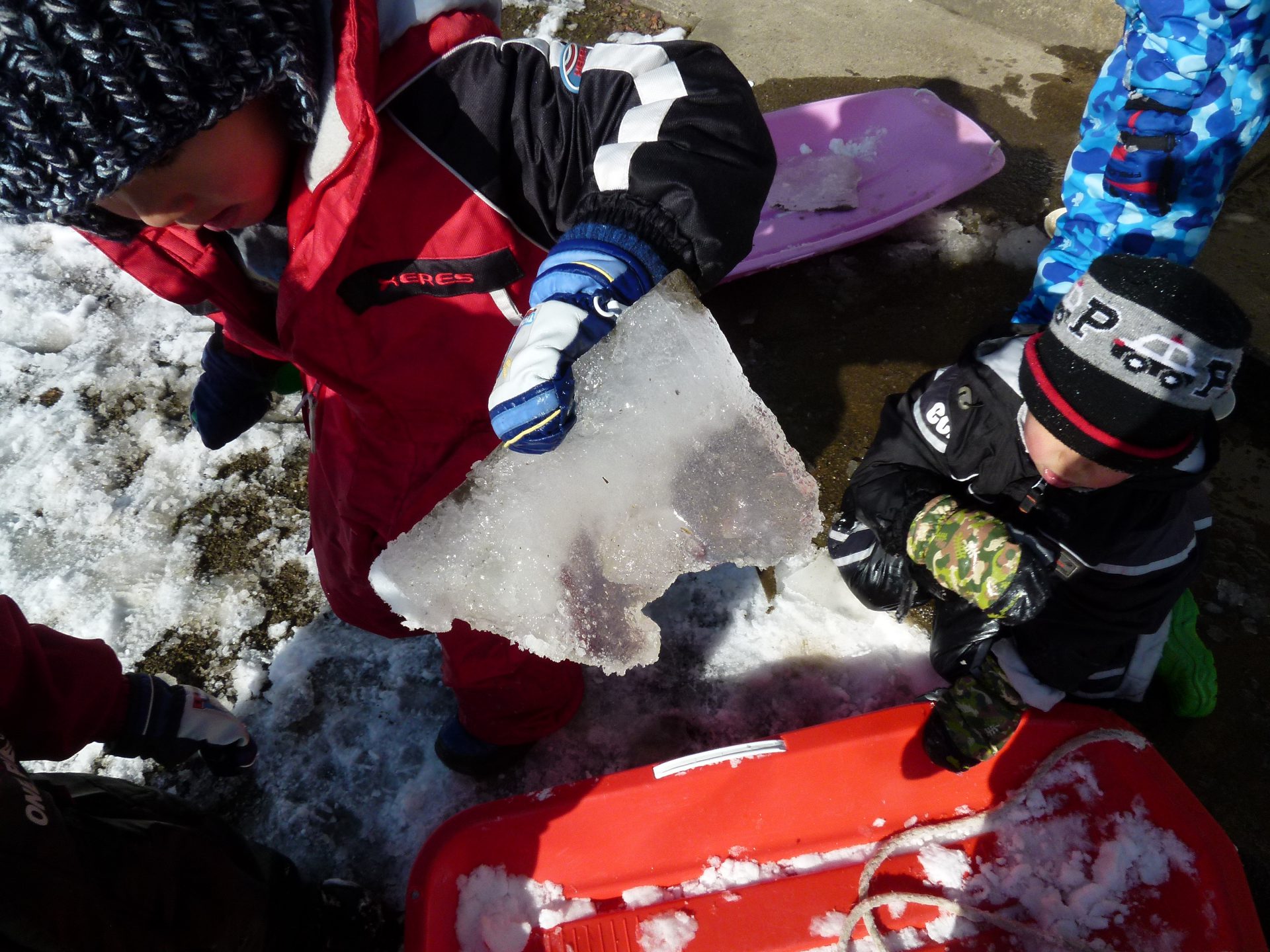 「こんなに大きな氷を見つけたよ!つるつるしてるね。」