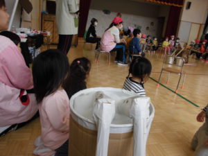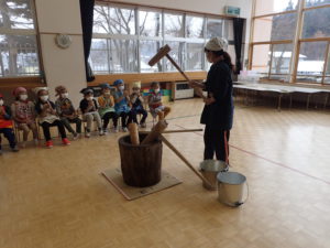 道具のお話をすると、「うす」「きね」と名前もばっちり。年長さんは得意気な様子でした。