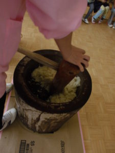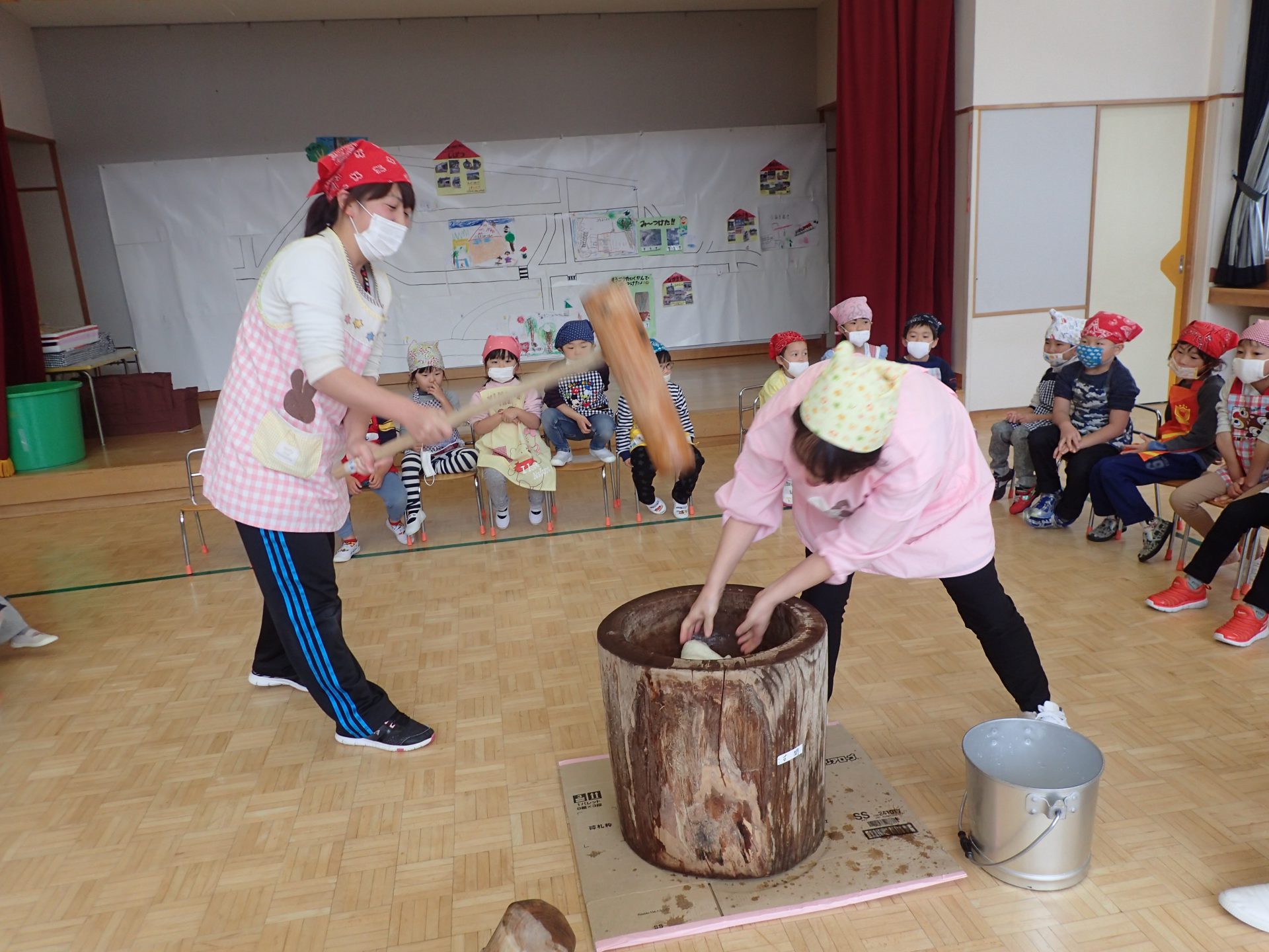本物のもちをつく前にみんなで「ぺったんこ~それぺったんこ~♪」と歌を歌い準備体操をして