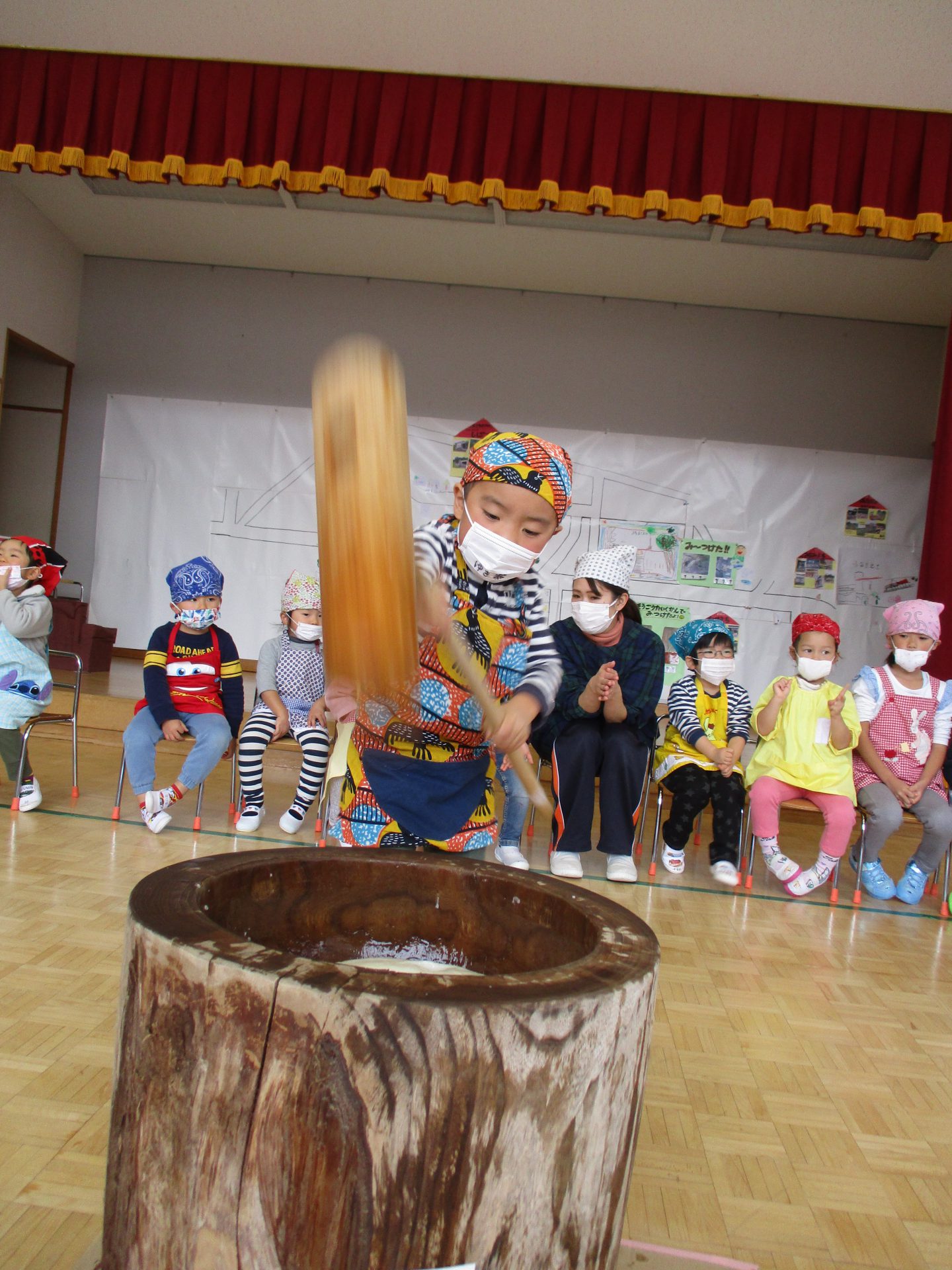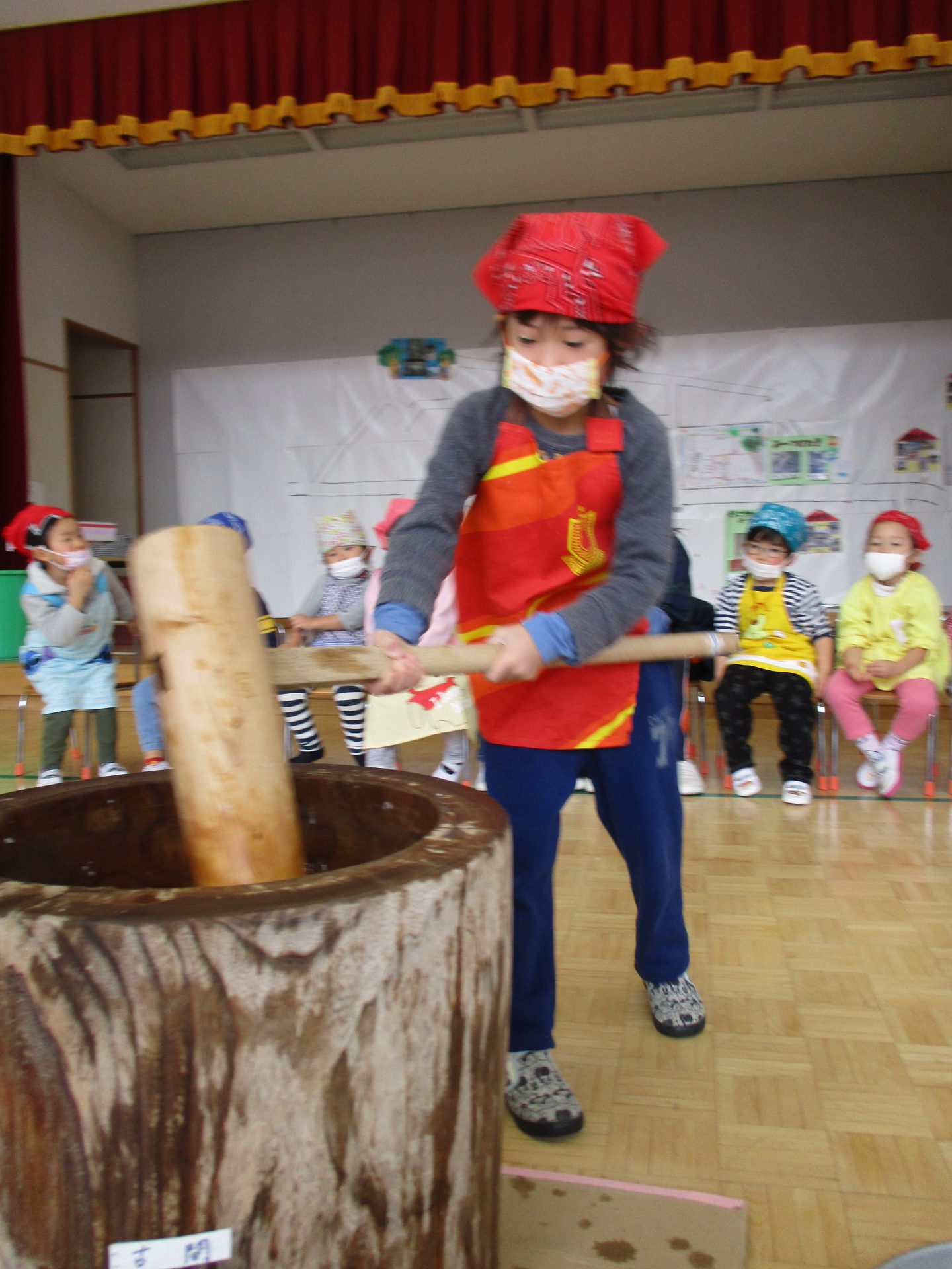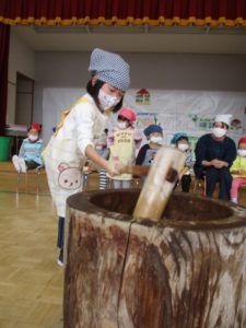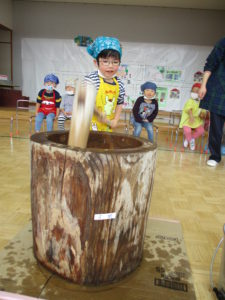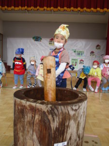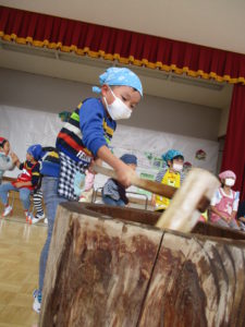 3・4歳児は小さい杵で頑張ってついていました。小さいといっても子ども達にとったら大きいんです!!