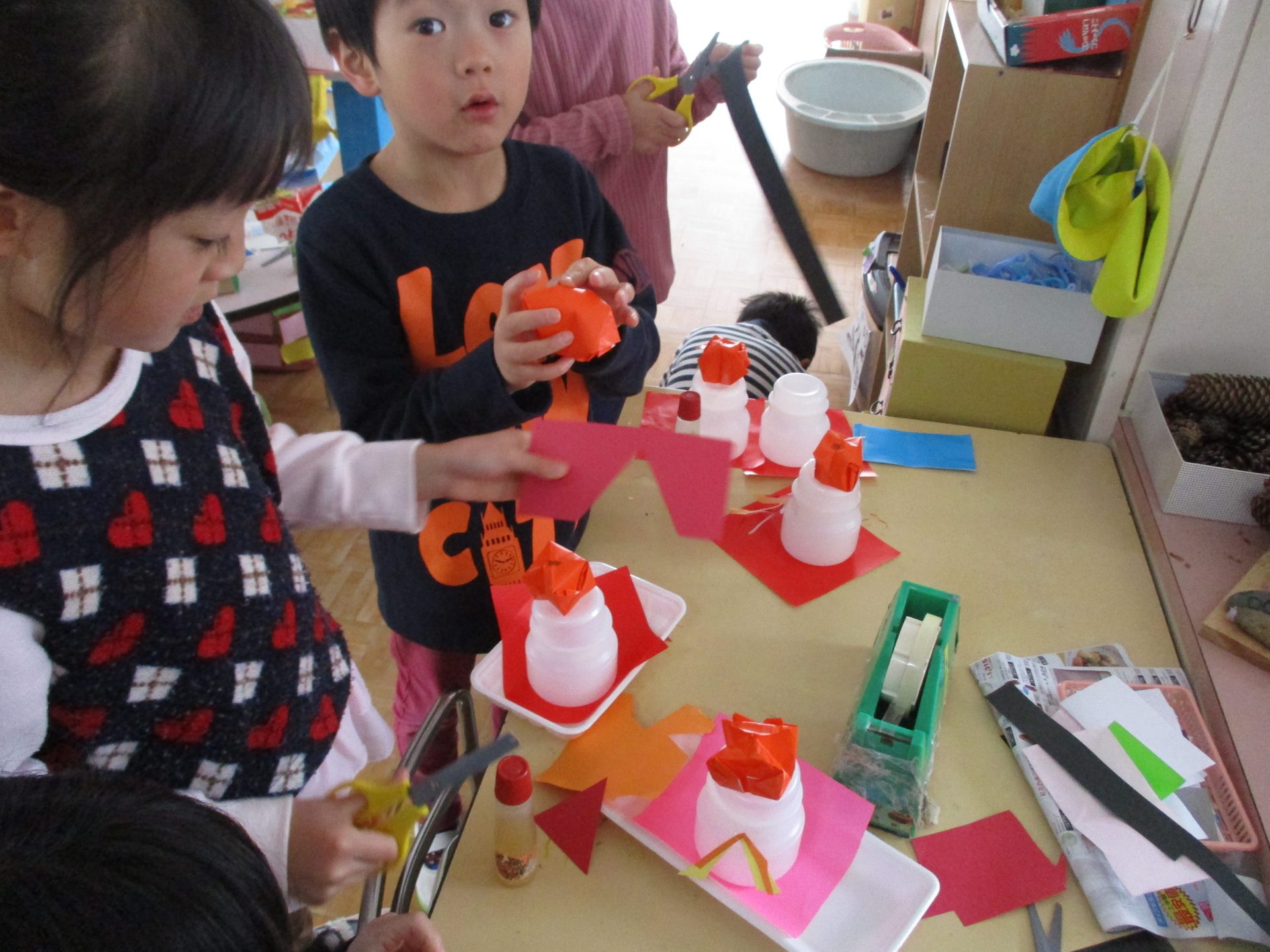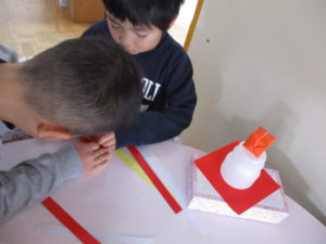 ここで子ども達は聞く、見る、触れる、嗅ぐ、味わうと5感で感じ興味や親しみを持っていました。また経験したことで「おもち」→「お正月」→「鏡餅」と連想させイメージを持ちいろんな素材を使って鏡餅作りを楽しんでいました。