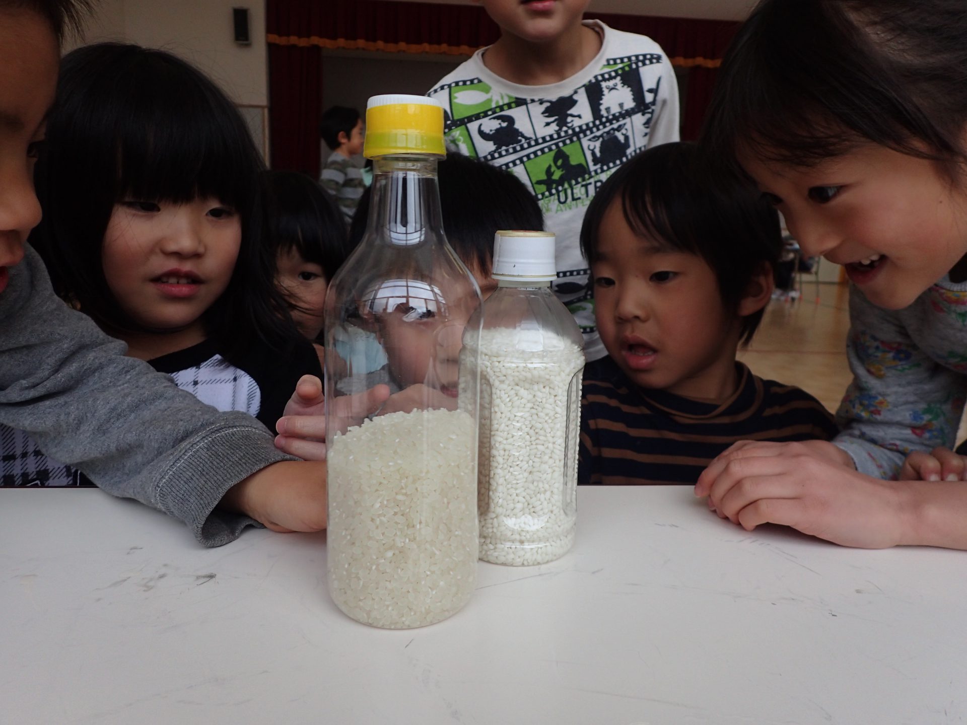 こんな子も「大きさはよーく見るともち米の方が大きい気がする」と大きさを比べ
