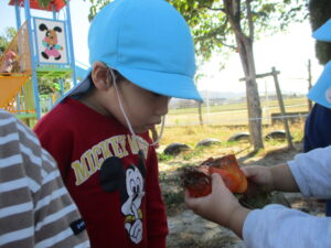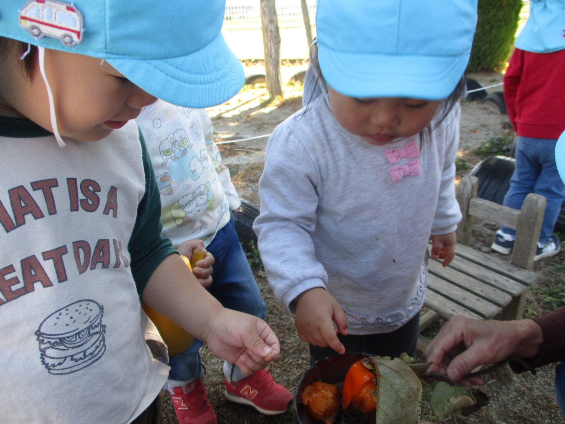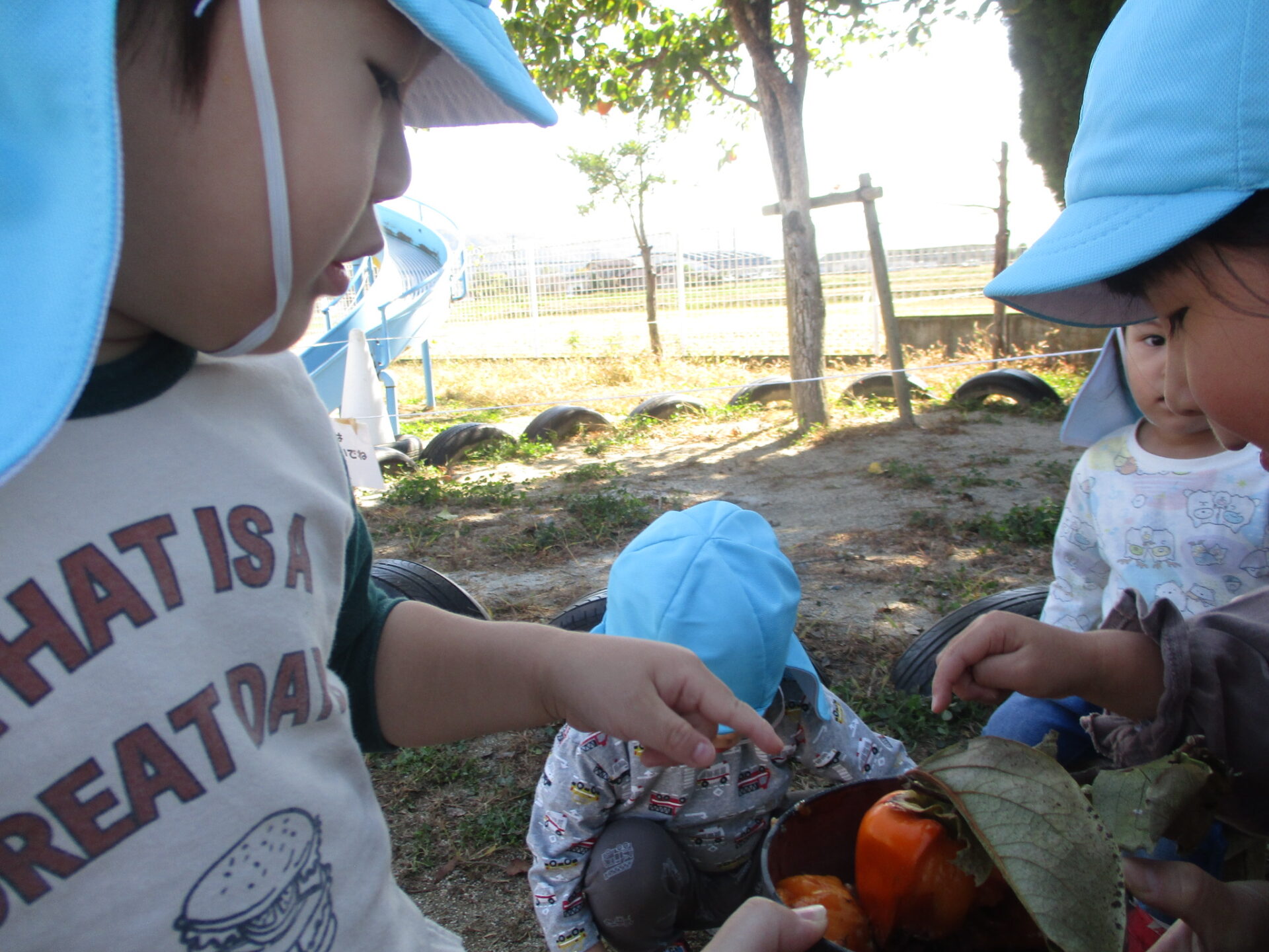 秋の自然に触れる中で、子どもたちはどんぐりや葉っぱ、赤い実や柿などに興味を持ち、見たり触れたりしながら身近な発見を楽しんでいました。