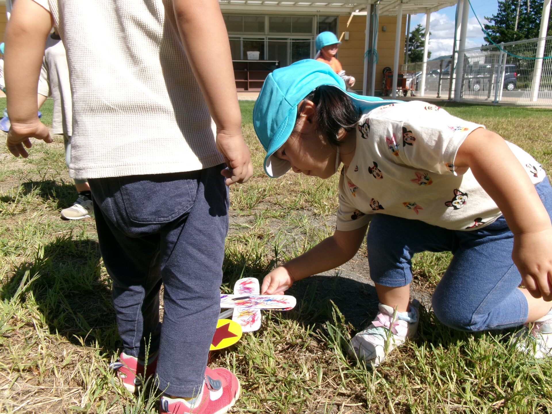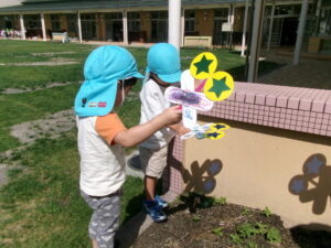 トンボを捕まえたり追いかけたりすることを楽しんでいる姿から、とんぼのめがねの制作を楽しみました。それぞれ好きな色のレンズを貼り、めがねをのぞくと「色が変わった!」「きれい!」と光や色の変化に気づき感動したり喜んだりしています。