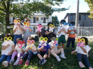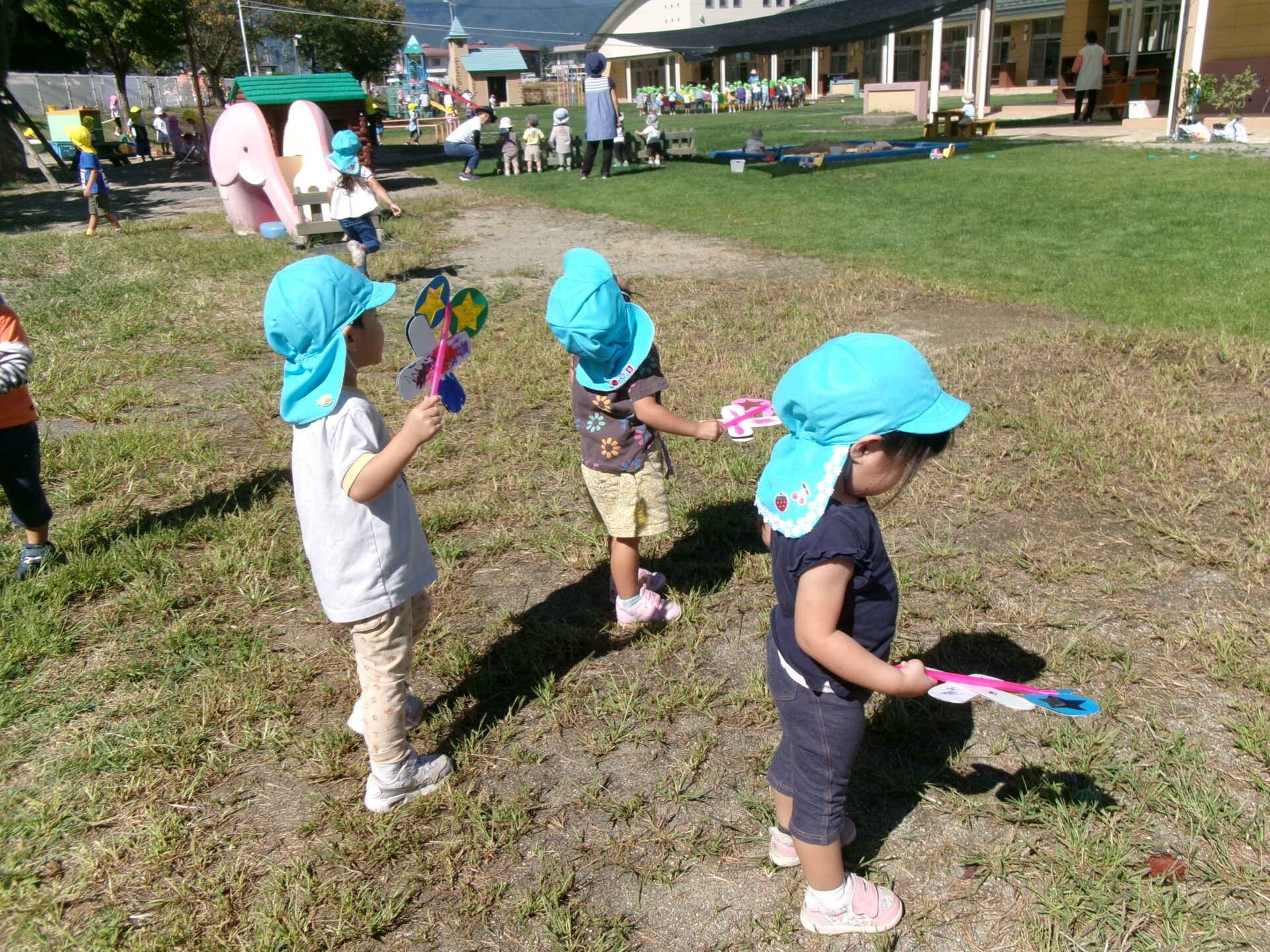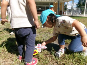 春から戸外遊びや散歩を通して、草花や虫など身近な自然に親しみ、自分の好きなものを見つけて集めることを楽しんできました。夏、秋へと季節が変わっても「今日はどんなものがあるかな?」と探すことを楽しみにする姿があります。見つけたものや出来事を友だちや保育士と共有する中で「また探したい」「もっと見つけたい」という期待感につながったり、見つけたものを共有して遊ぶ楽しさを味わってほしいと思います。