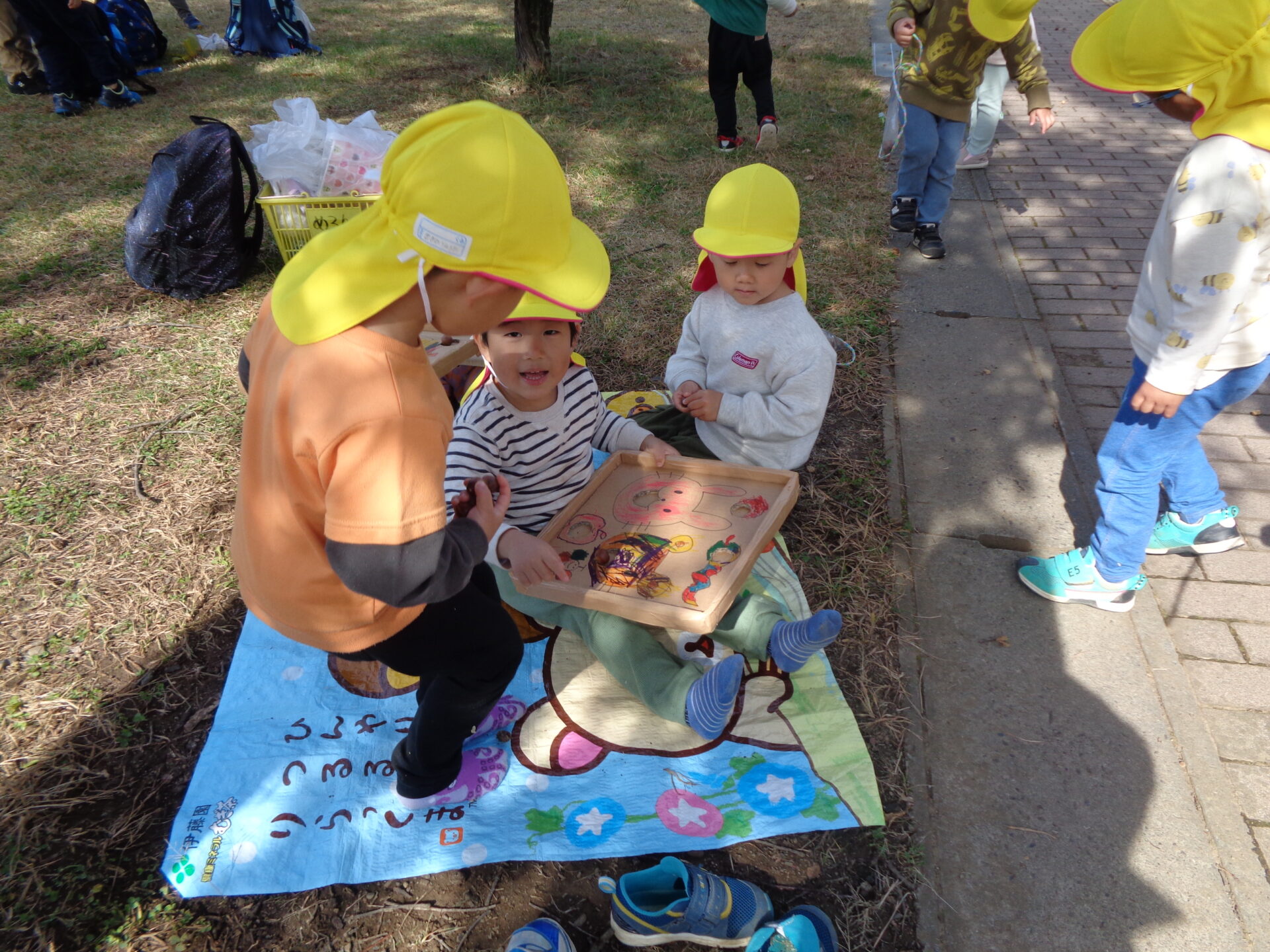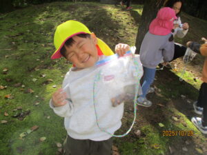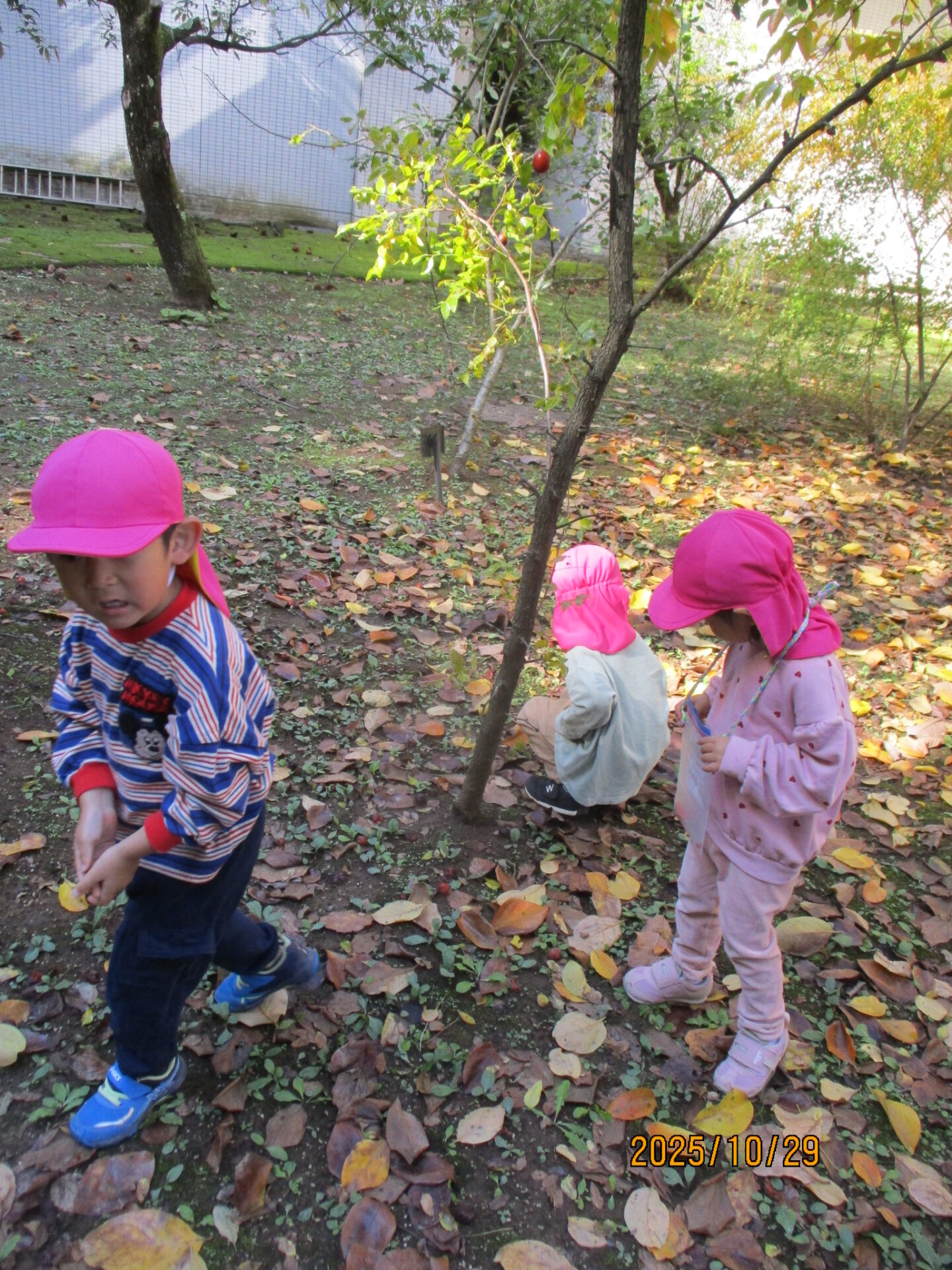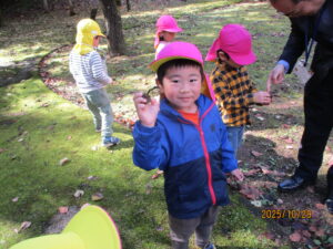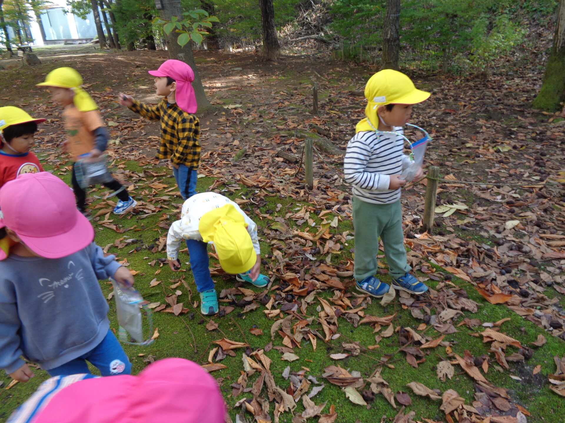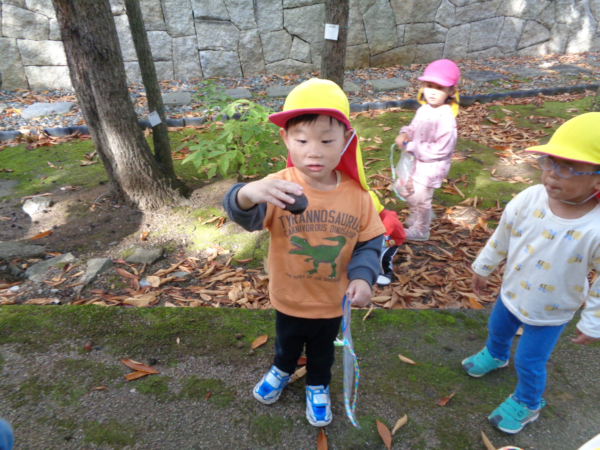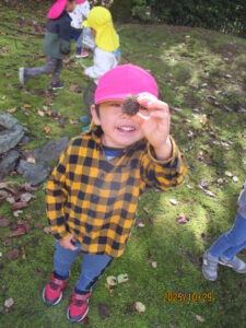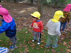 また、「なんで穴が開いてるの?」「色が違うね!」「大きいの見つけた!」「これは何?」など興味を持って木の実を集めることを楽しんでいました。袋いっぱいに集めて「先生見て!」と宝物のように見せてくれる子ども達。その嬉しさや喜びに共感しました。