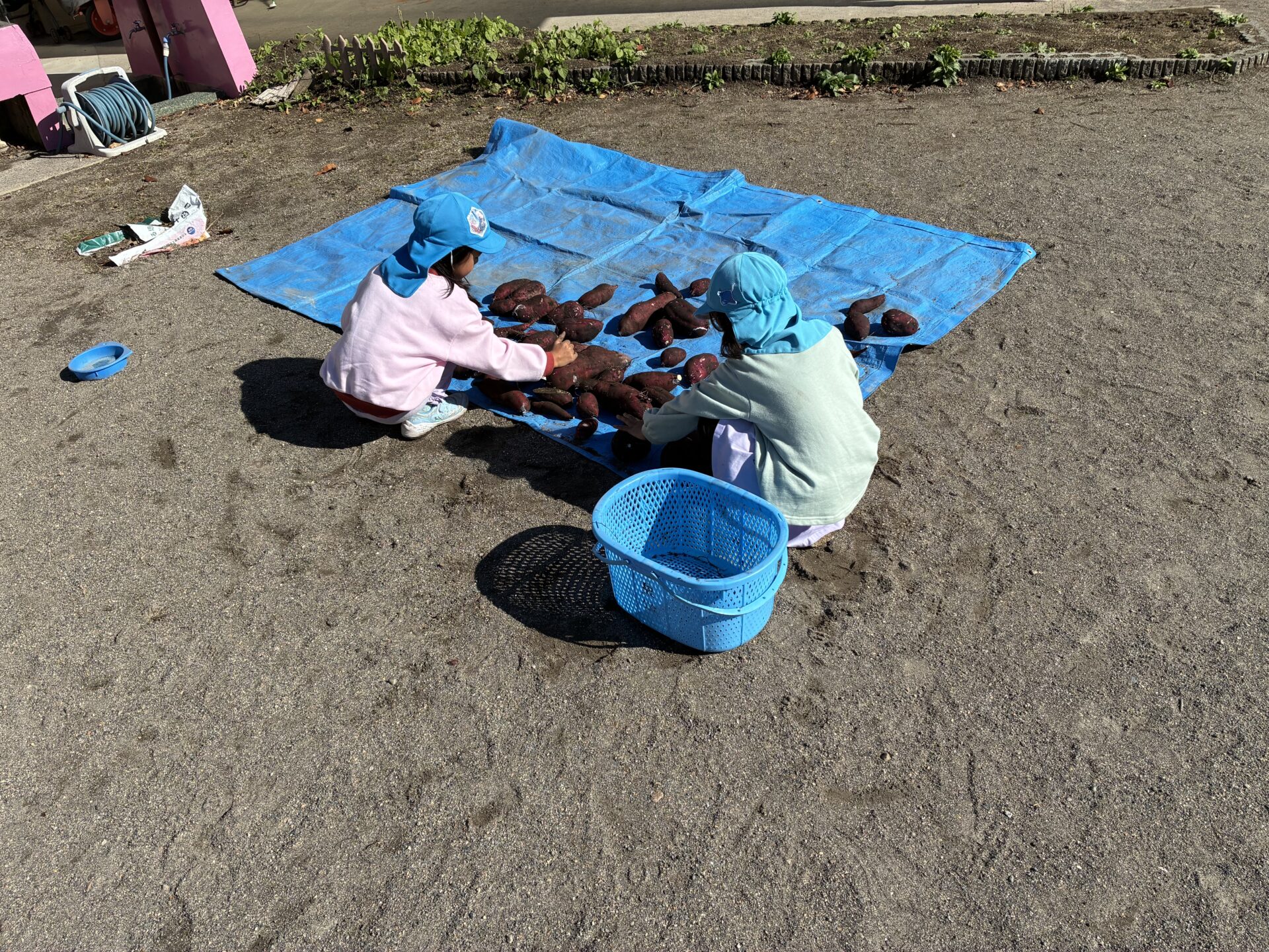掘れたサツマイモは、ブルーシートに並べて干しました。