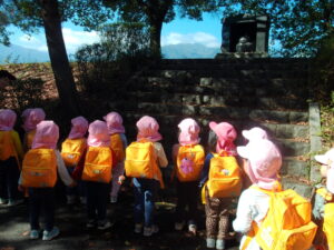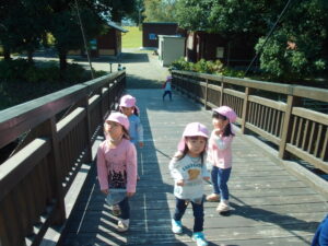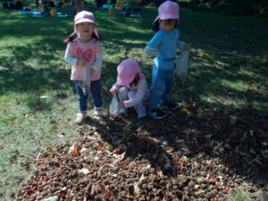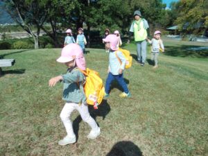 「かじかの里」へ行くといっぱいどんぐりがあるよと聞いて、かじかの里まで歩けるように、涼しくなったらたくさん散歩に出かけ、園庭で体を思い切り使って遊び、遠くの公園まで歩ける体づくりの準備をしました。