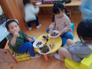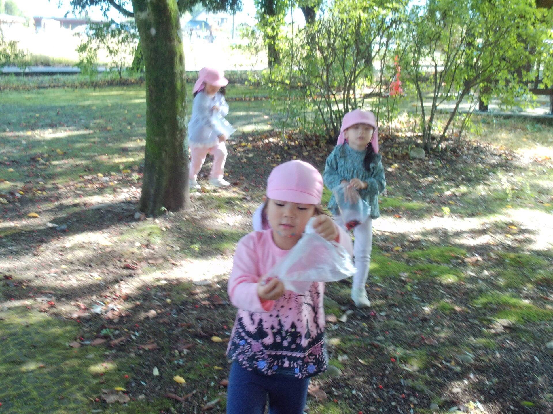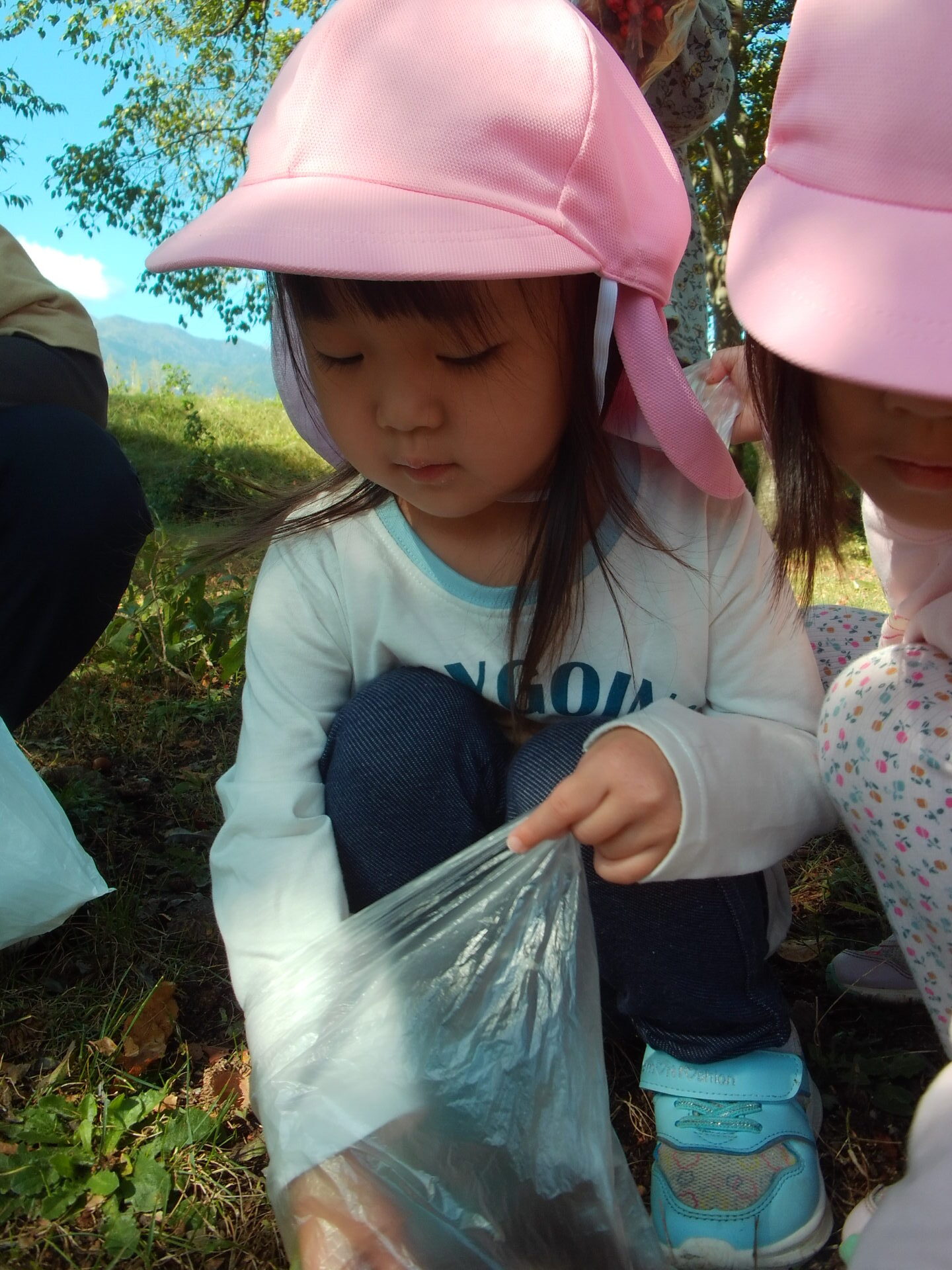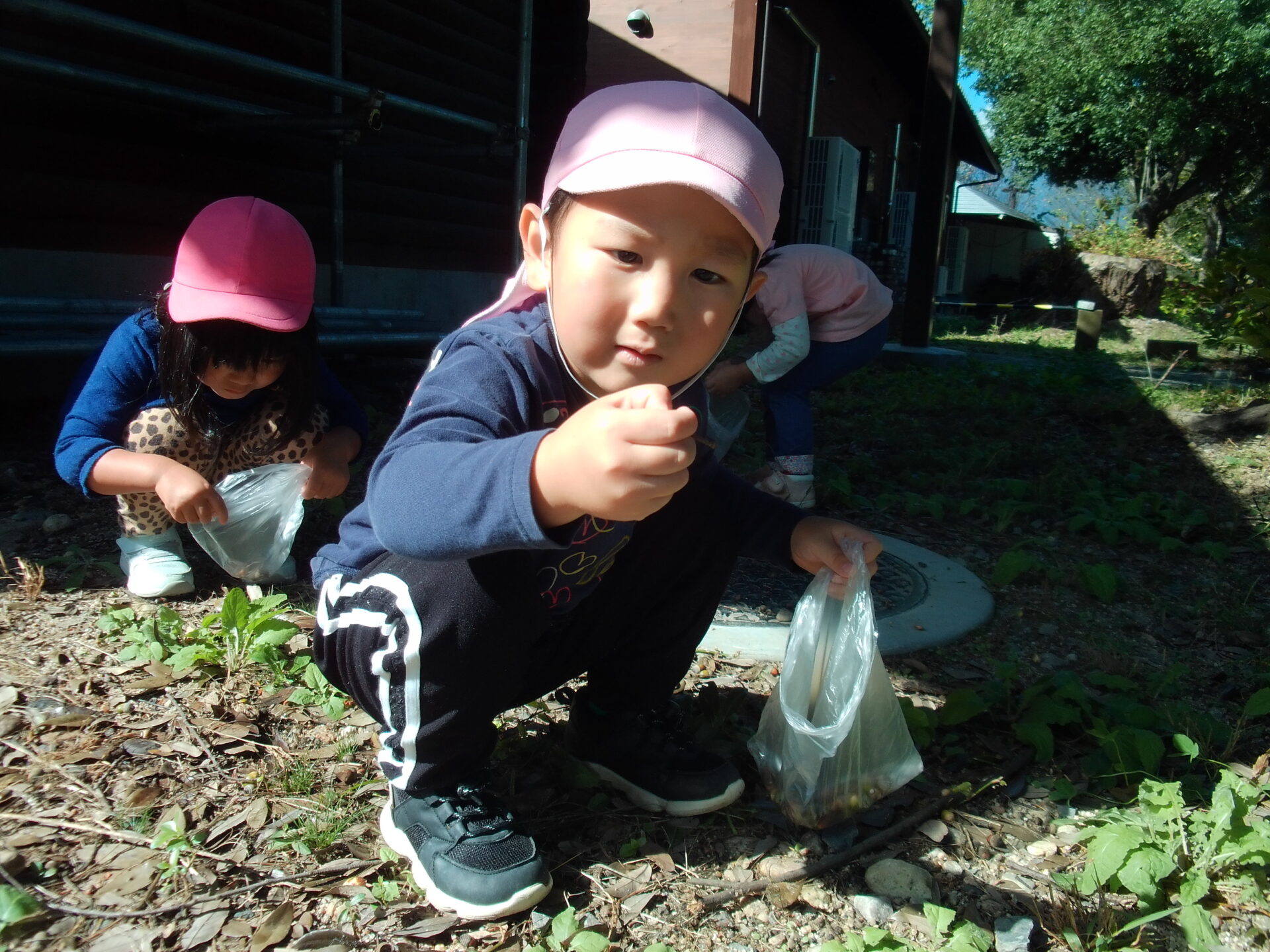 たくさんの散歩を繰り返したことで遠くまで歩くことできるようになり、かじかの里に行くことができました。そして楽しみにしていた、木の実が収穫でき、安曇野の秋を体いっぱいに感じ、遊ぶ楽しさを味わうことができました。