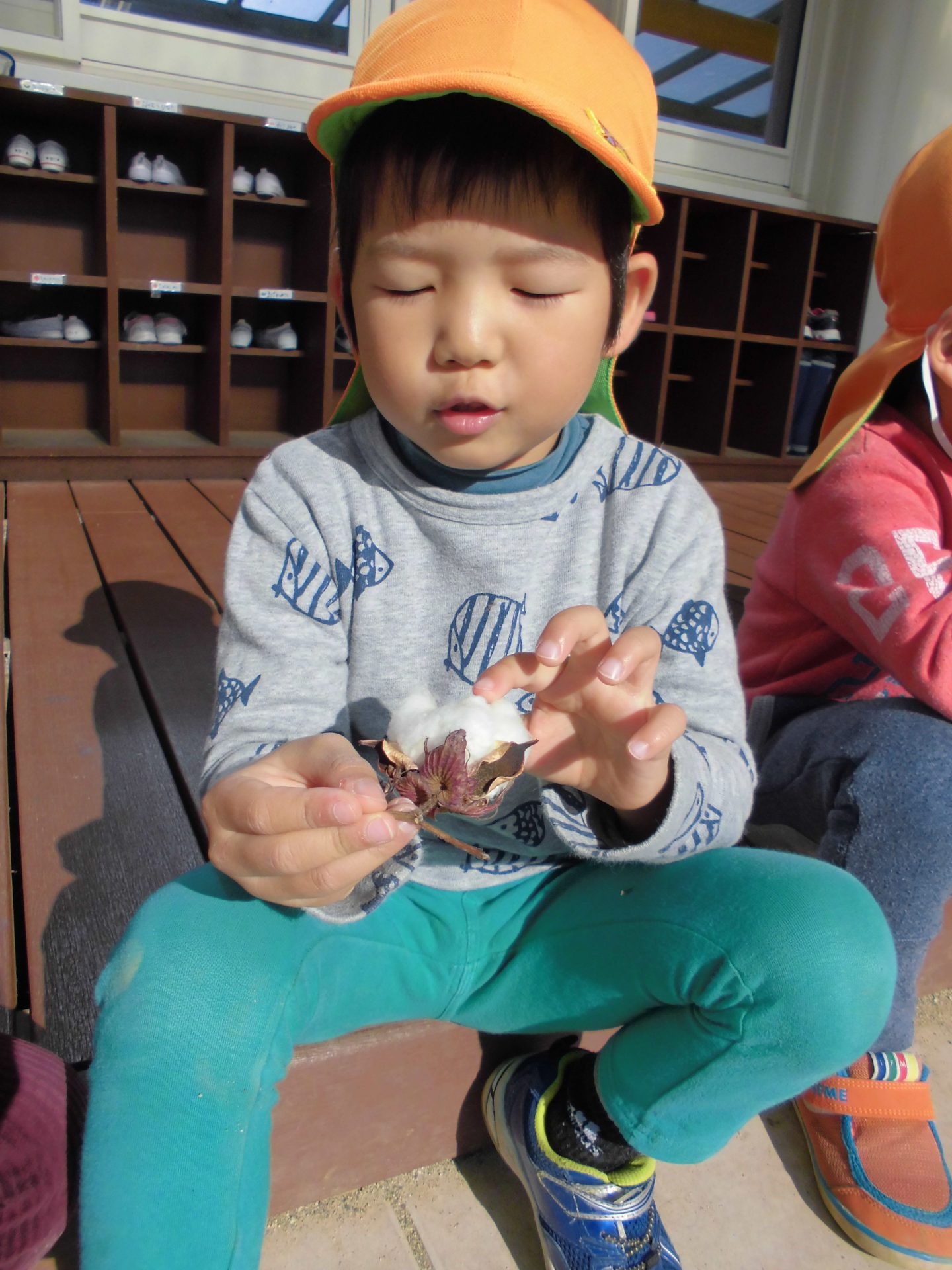 「綿」を育てたり身近に見たりする経験のない子どもたちにとって、花が咲いた後に実がどんどん膨らんでいく様子はとっても不思議に見えていました。