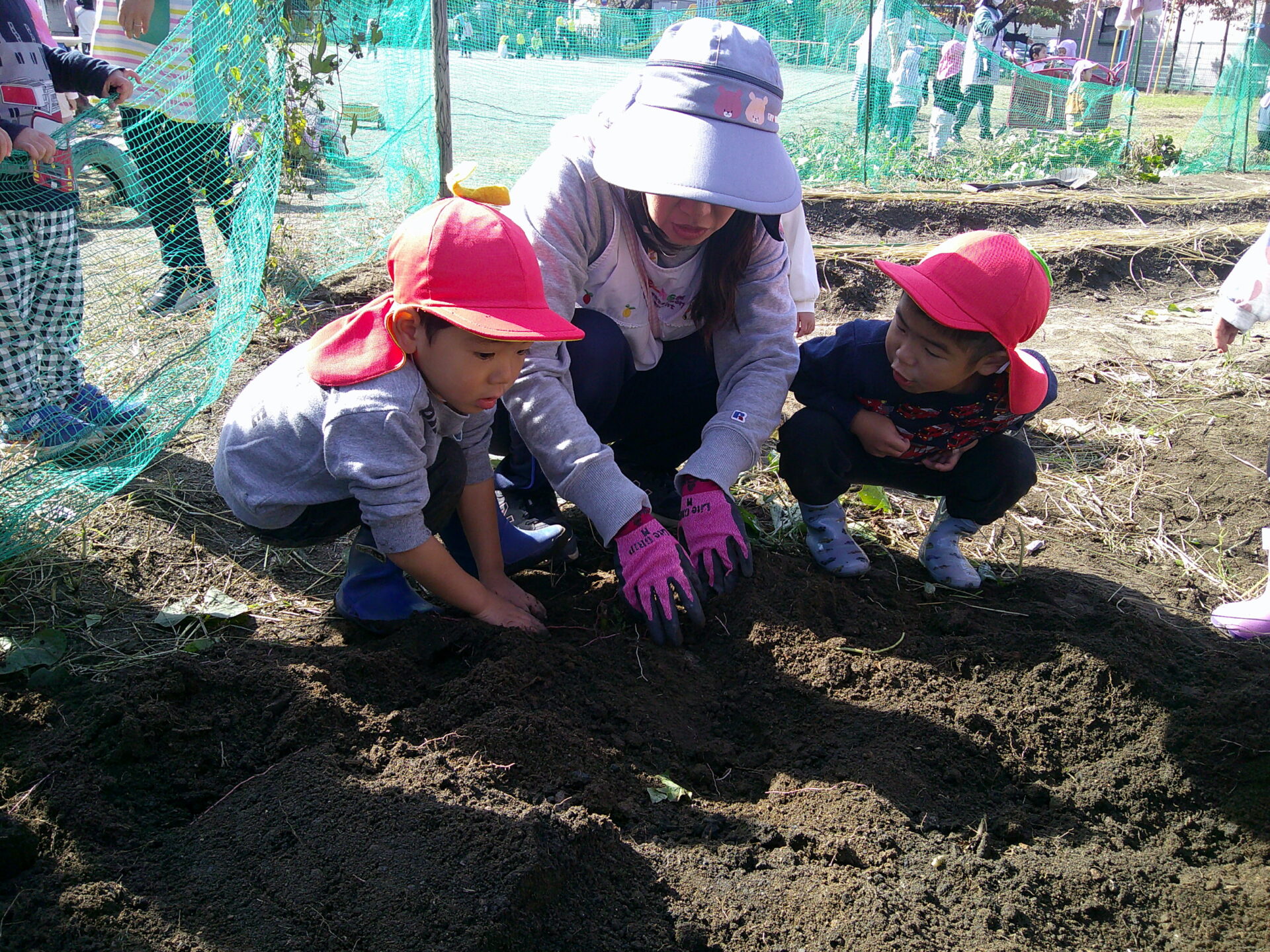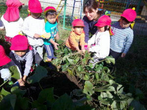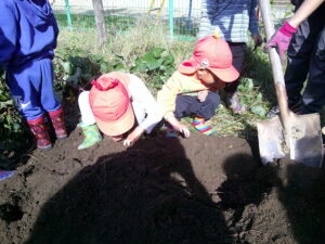 「こっちは赤ちゃん芋!」「これはだるま芋」と出てくるお芋を見せ合い、様々な形や大きさのお芋に喜び、夢中で掘っていました。