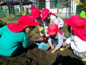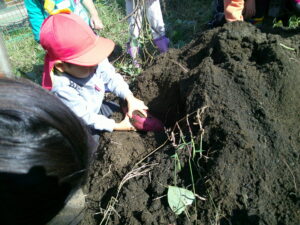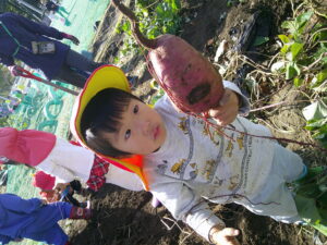 様々な形のさつまいもがあることに興味を持ち、「これは恐竜みたい」「これは小さいから赤ちゃん」と面白さを感じながら収穫する姿がありました。