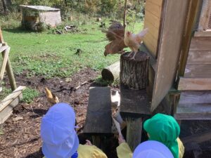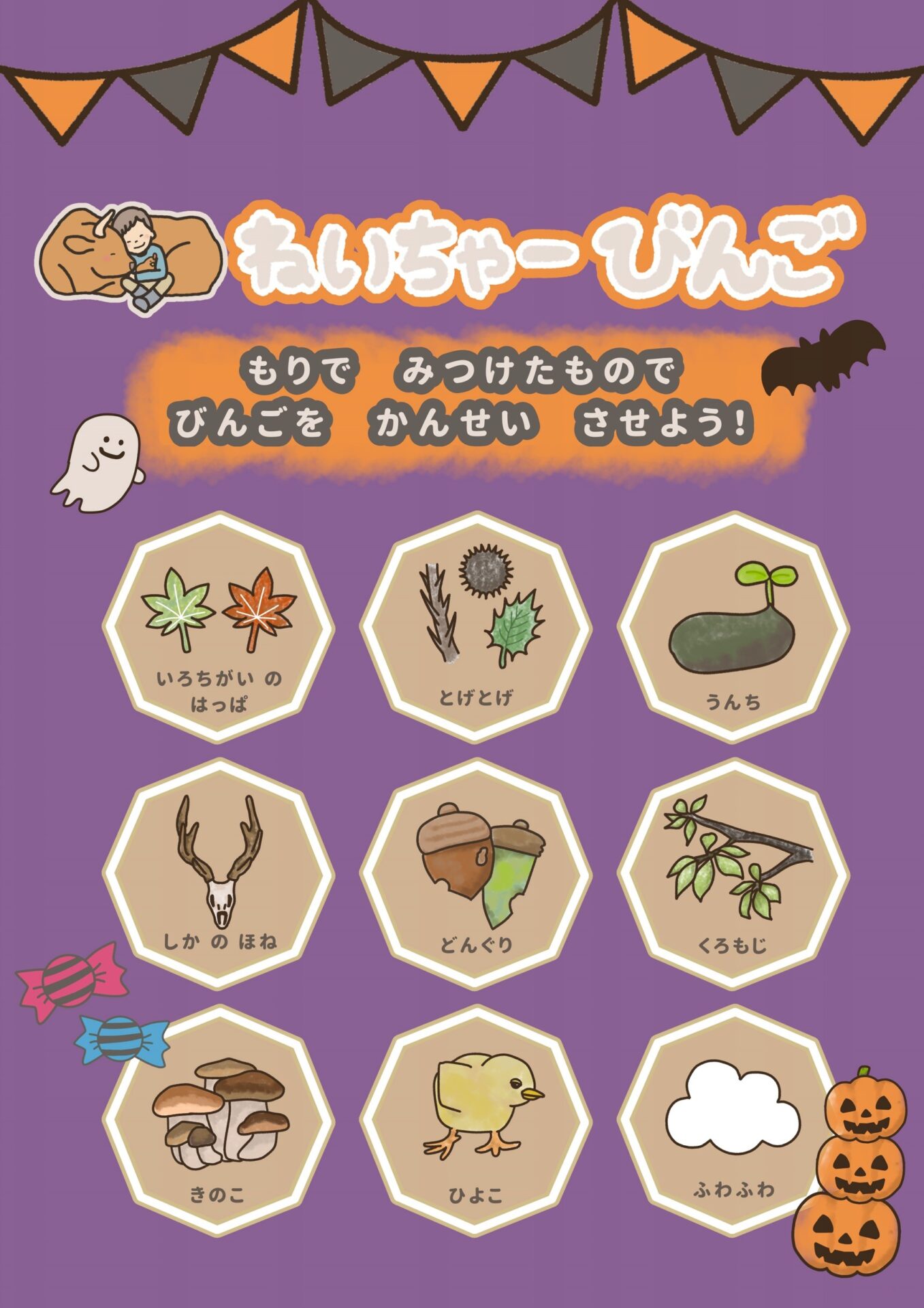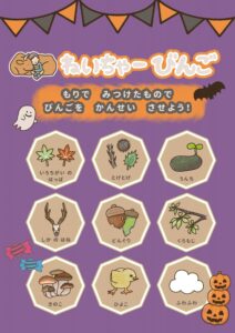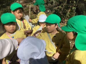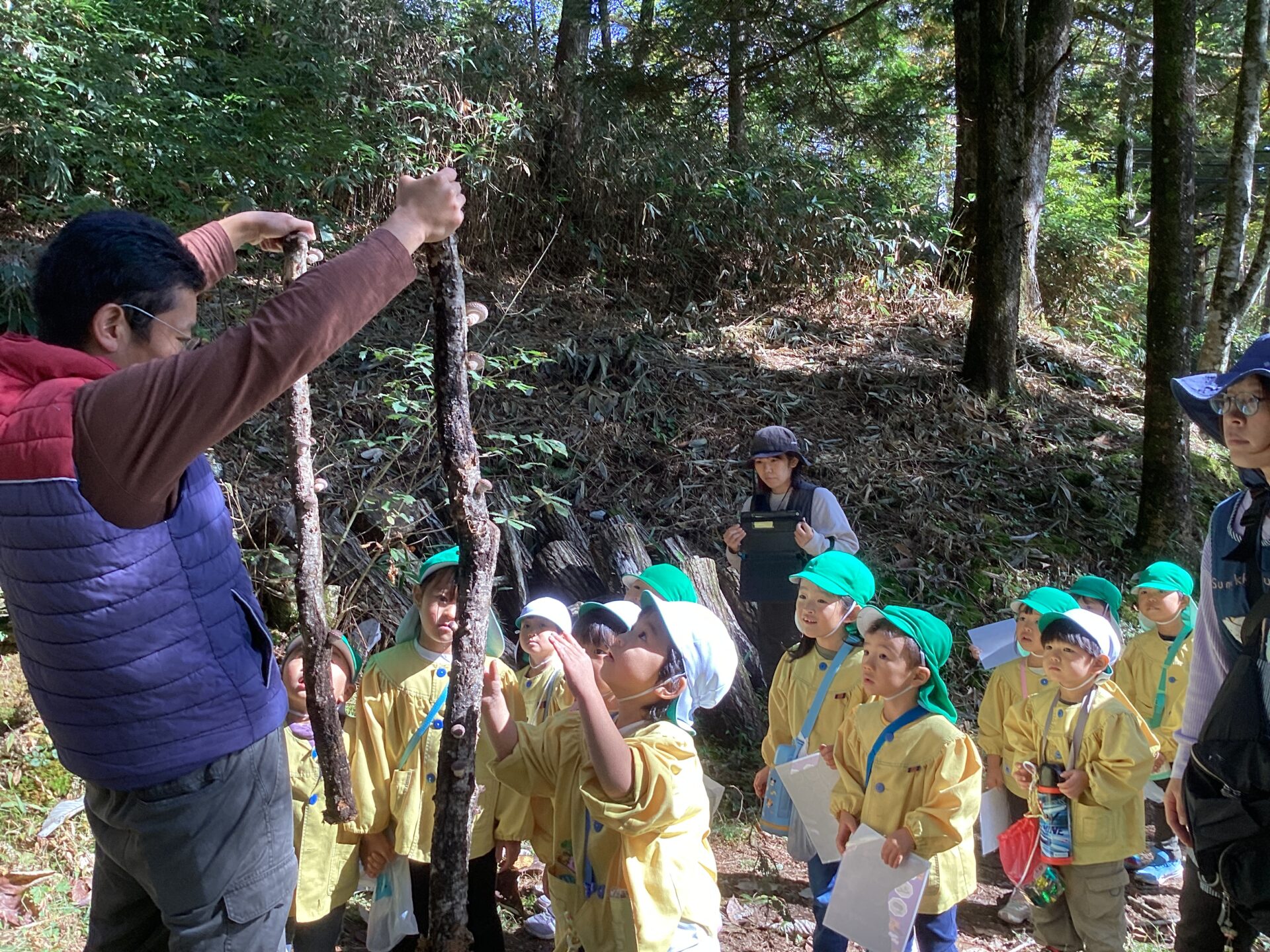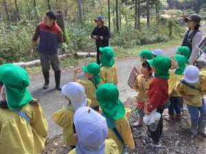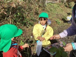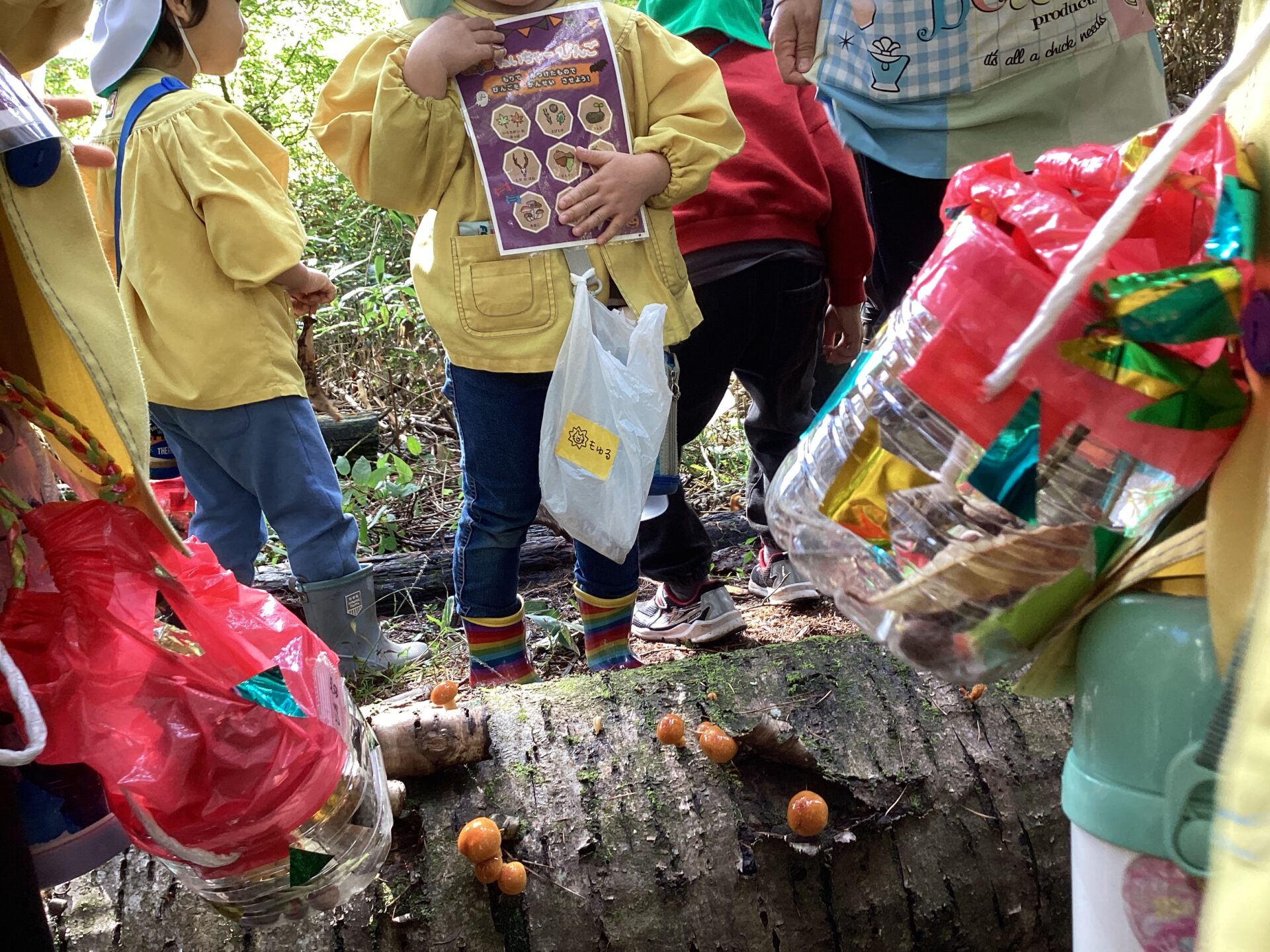 行きのバスの中で、ビンゴカードの絵を見る時間を作ることで、「ふわふわってなんだろうね。」「だれのうんち?!」「ほねみたい!」等と自由に言いながら、ハッピーマウンテンには何があるのか、想像を膨らませ、期待と楽しみな気持ちが高まっていました。グループは3つ(運動会の時と同じ)に分けることでスムーズに探索が楽しめたと思います。また、帰りにはしいたけやなめこ等の収穫体験をさせていただき、子ども達は夢中で収穫を楽しんでいました。収穫したナメコは給食で出していただき、子ども達が給食の食材に関心をもって食べる姿がみられ、良い経験ができました。自然がいっぱいのハッピーマウンテン、今回は秋の自然をたっぷりと見つけて楽しみました。今度は他の季節にも行って、色々な発見を楽しみたいな、と思いました。