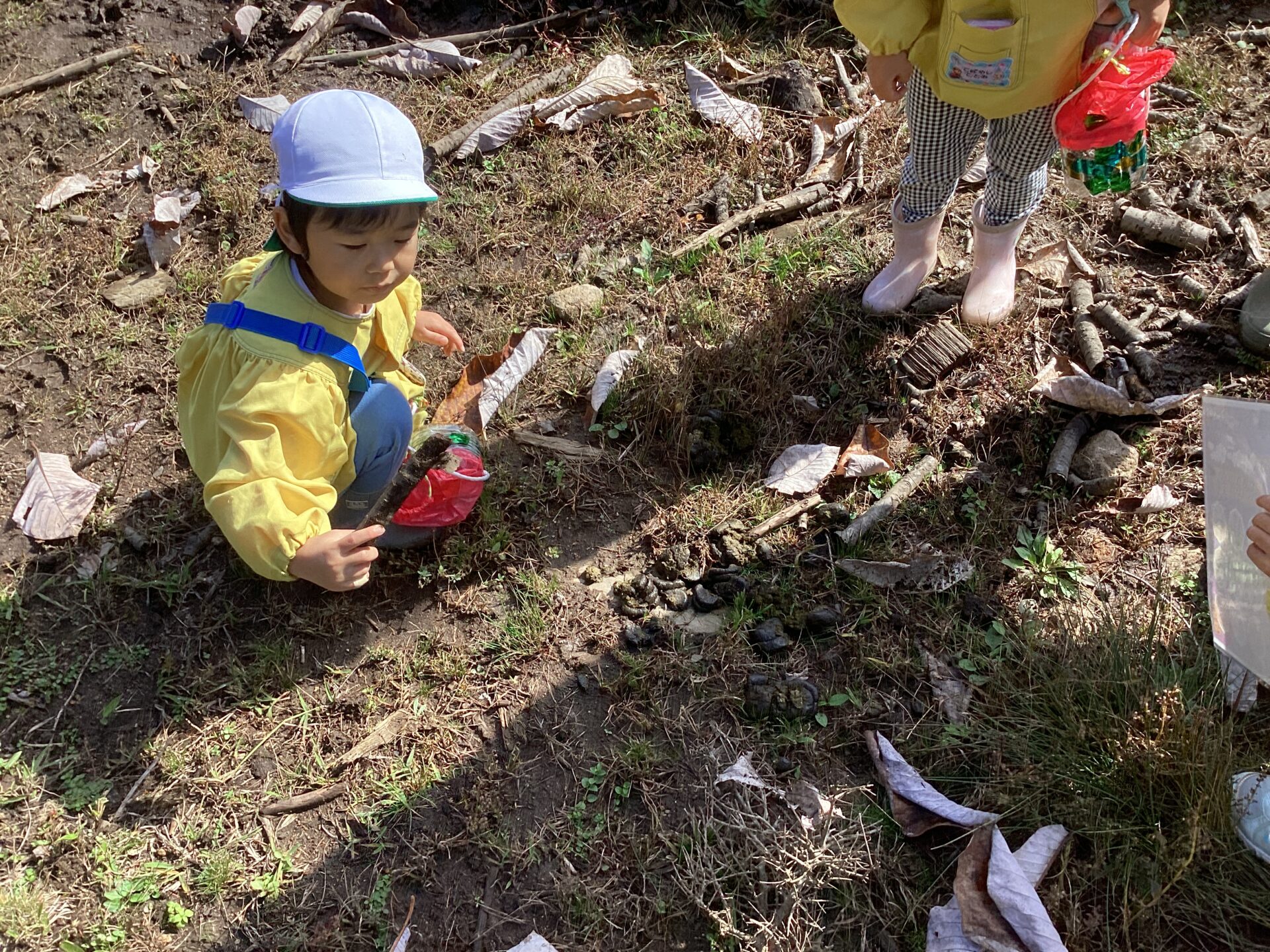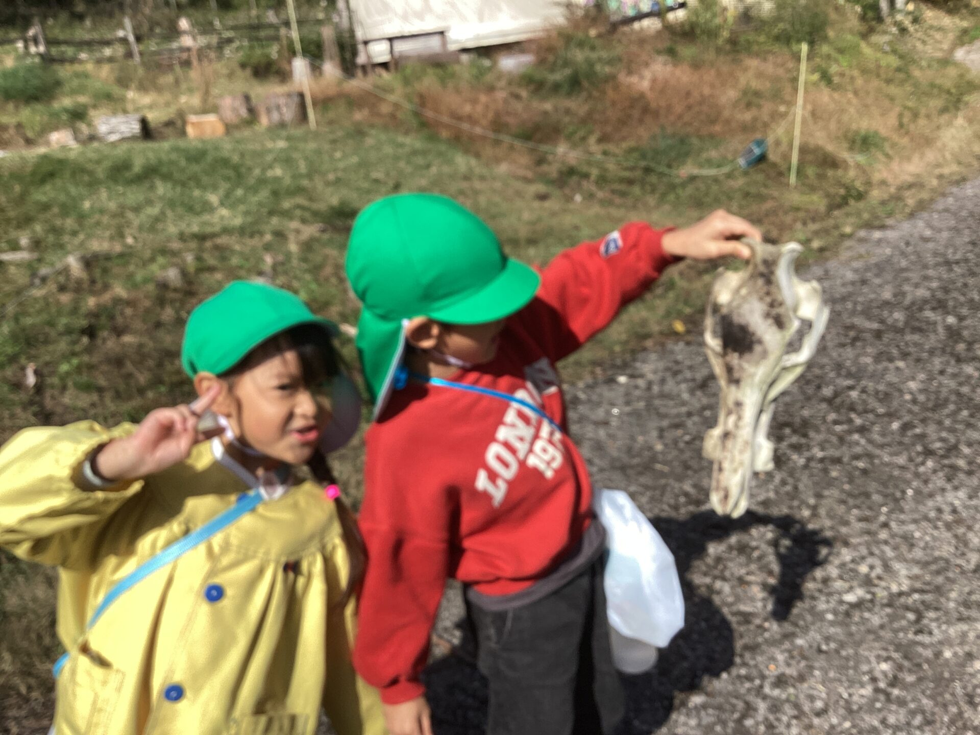 秋のハッピーマウンテンで、色々な植物を見つけて触ってみたり、動物の骨やうんち、生き物等を見たり、触れたりと満足感いっぱいの子ども達でした。