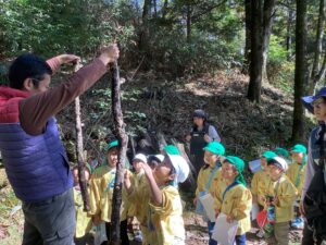 幸山さん 「今日はみんなで探して見つけて触れるものは触ってみようという会です。目的はみんなに森と友達になってもらいたいと思っています。森と友達になったらお母さん、お父さんに学んだこと、知ったことをぜひ伝えてほしいと思います。」
