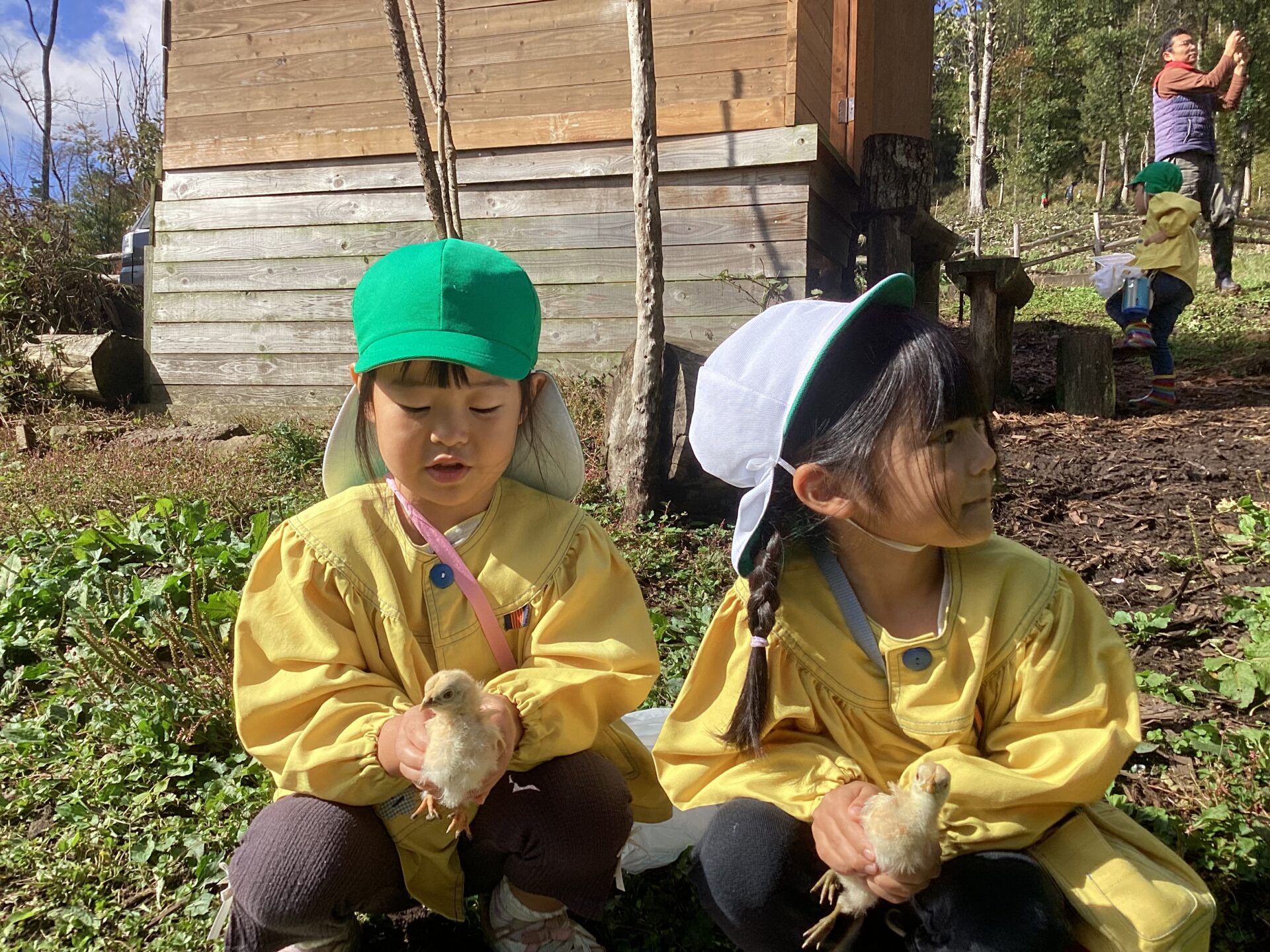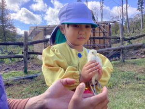 幸山さんがひよこを何羽か小屋から出してくれて、触らせてくれました。ひよこを触っている時は大きな声を出してびっくりさせることのない様に小さな声でしゃべる子ども達。