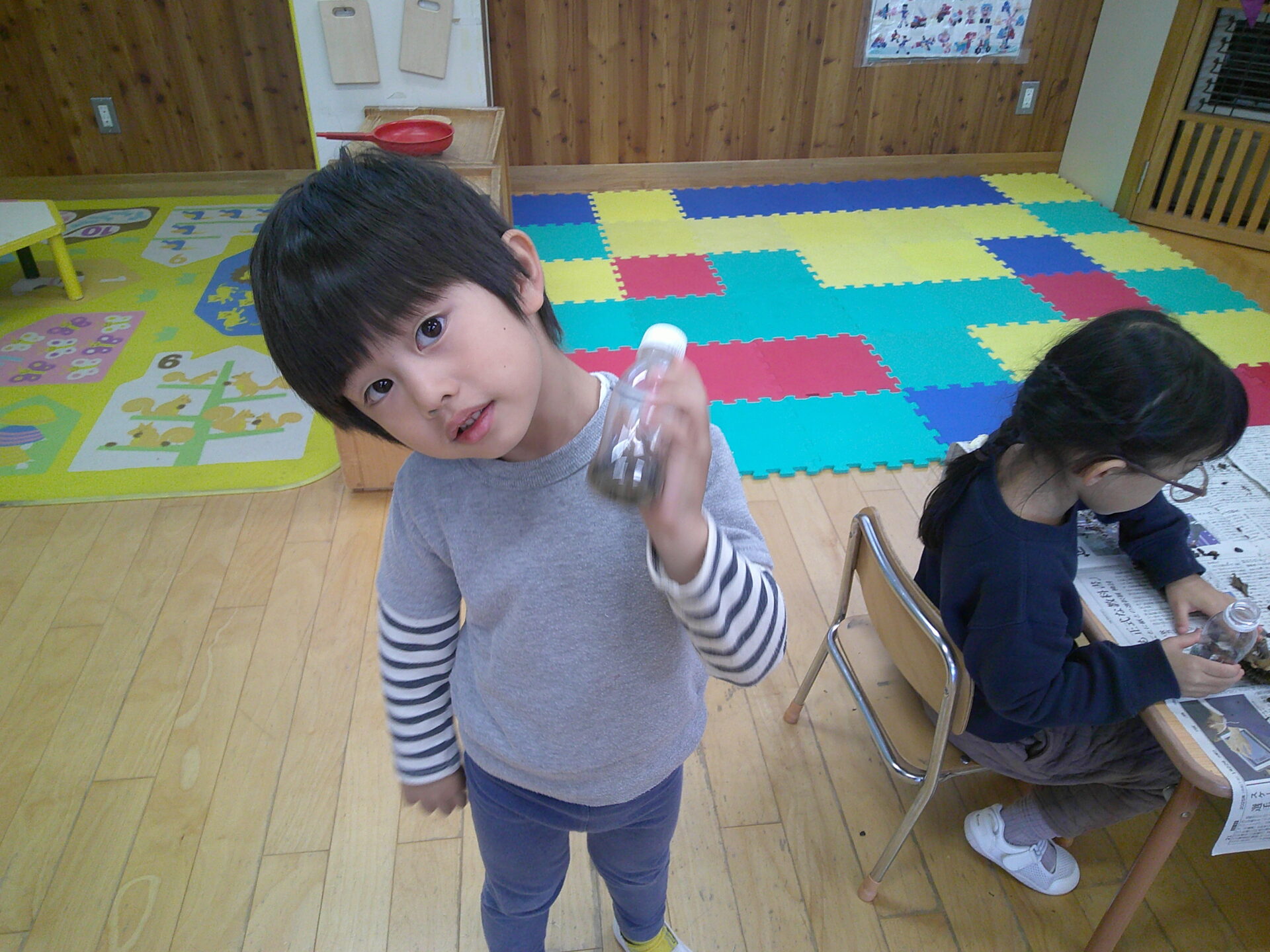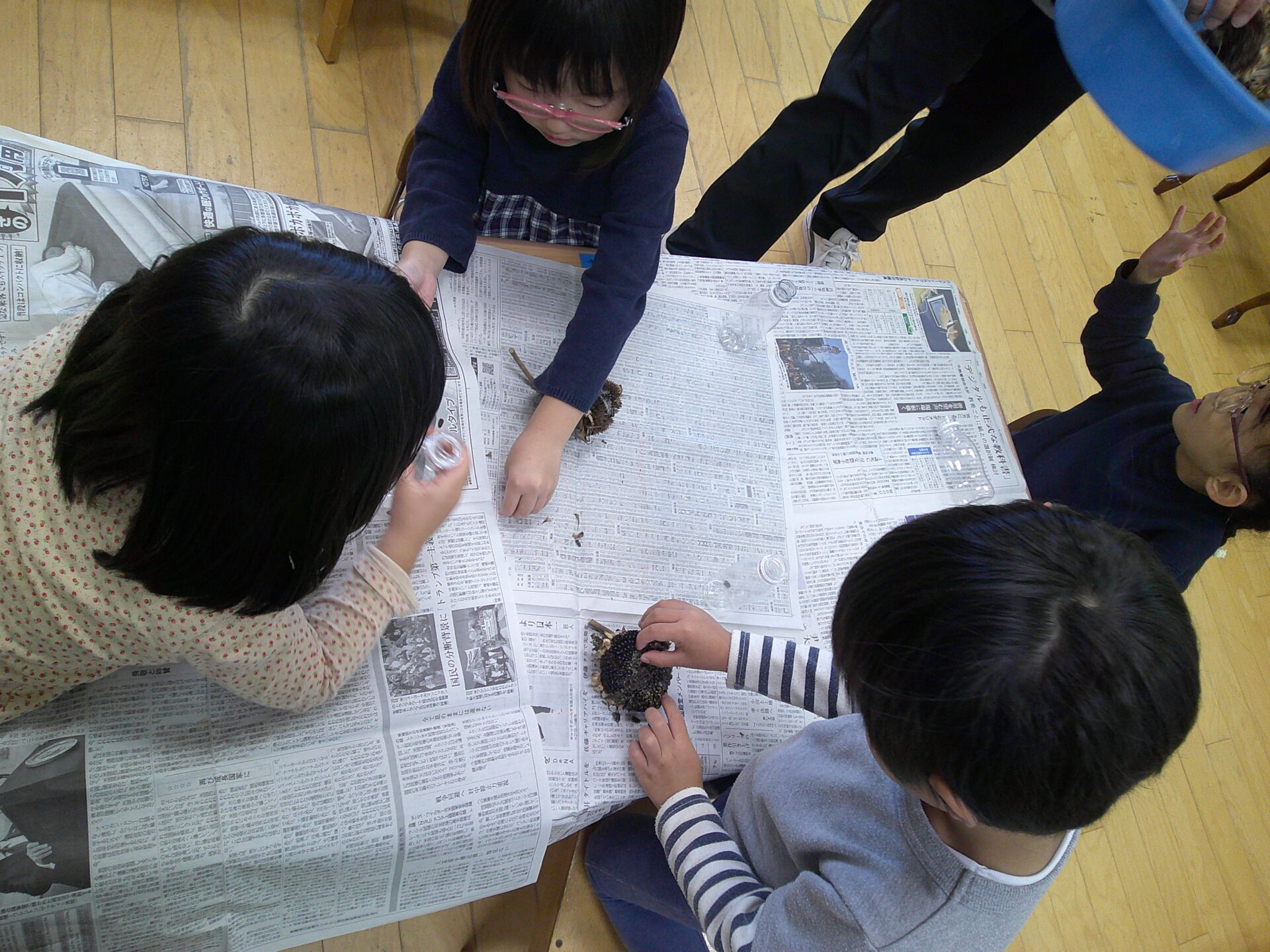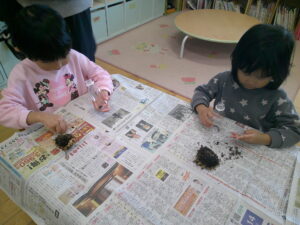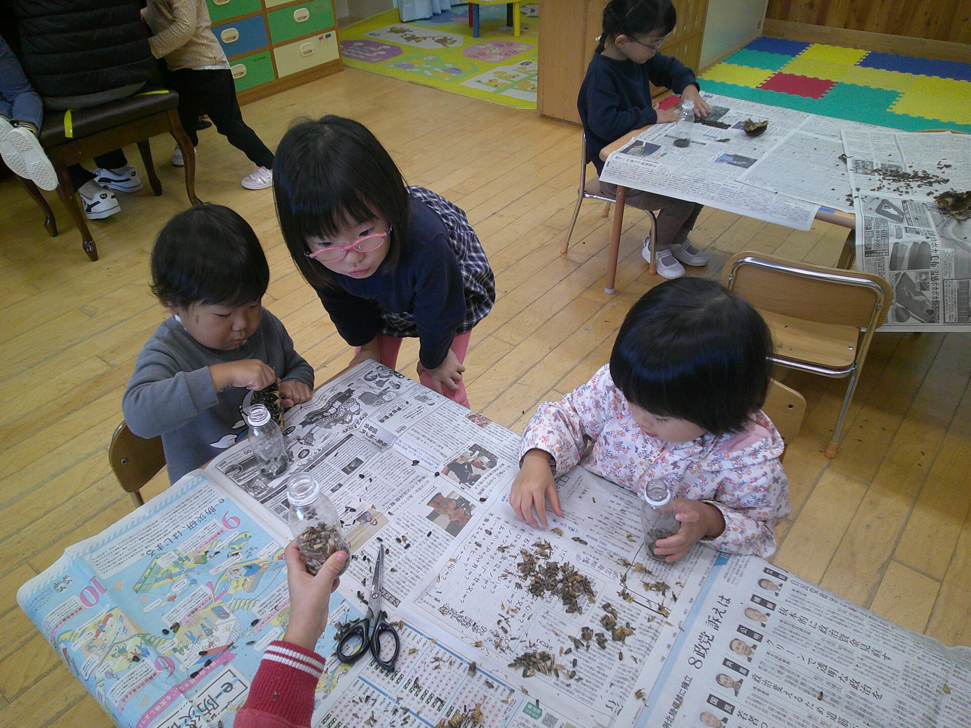 ・ひまわりの種を根気よくペットボトルに入れていて、みんなよく集中して取り組んでいる姿に驚かされました。
