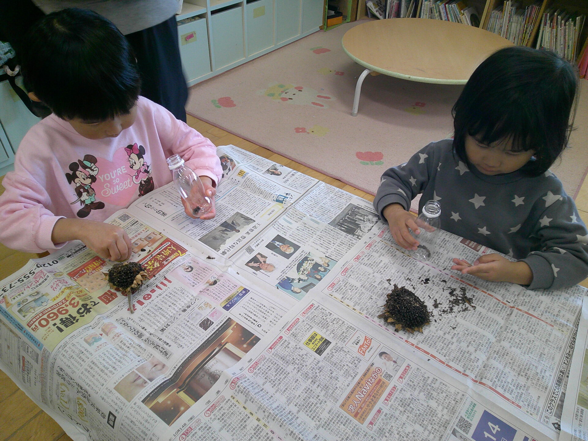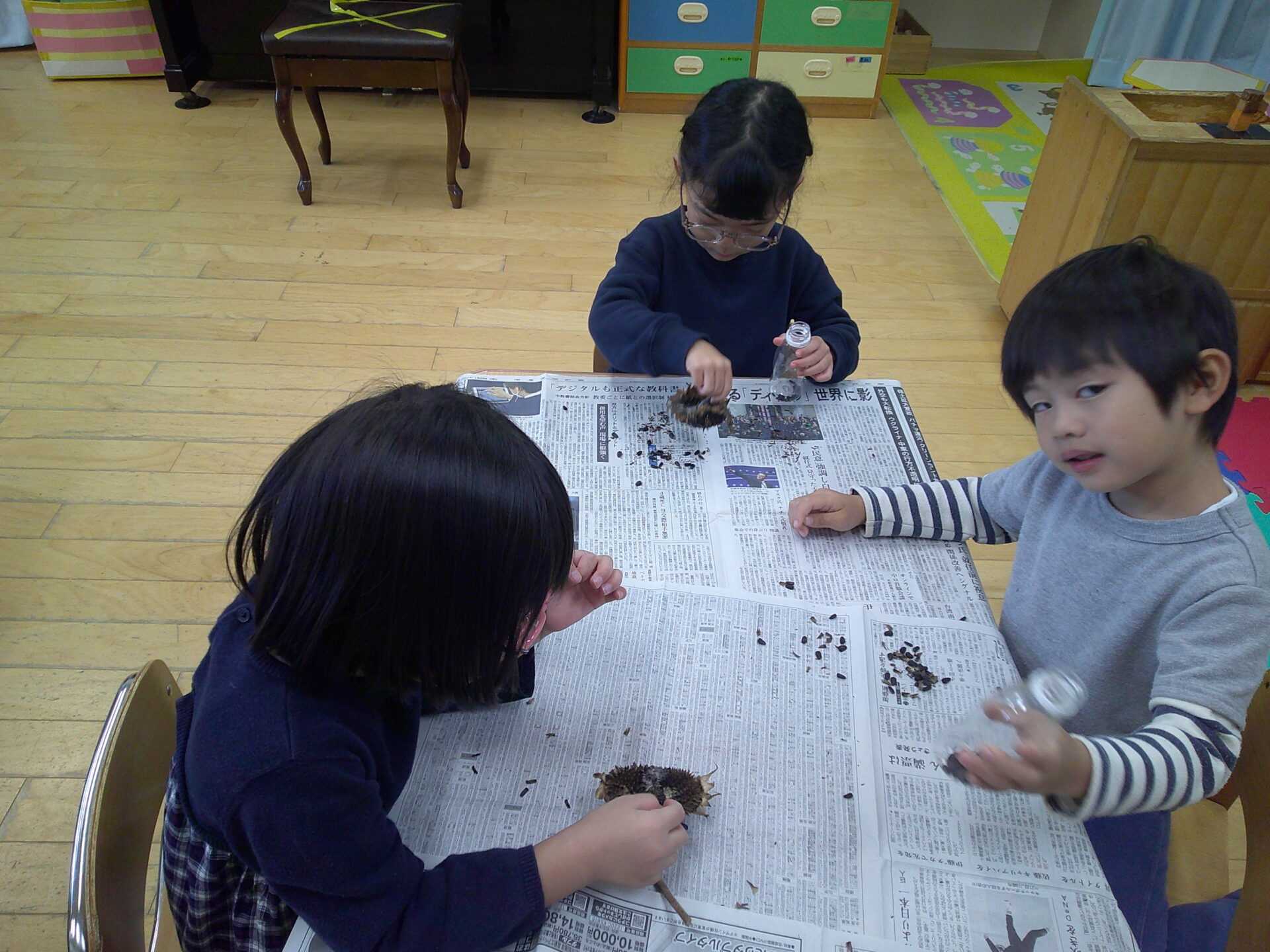 みんなで育てたひまわりの種を取り出して小さなペットボトルに入れ、マラカス作りをしました。