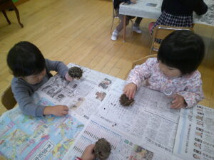 ・できあがったマラカスの音を楽しんだり、普段から歌っていた”どんぐりころころ”の音楽のリズムに合わせてマラカスを楽しげに鳴らしていて、マラカスの完成や演奏を楽しんでいました。自分たちが育てたひまわりで自分たちの手で作ったからこそ喜びや発見がよりあったのではないかなと思います。