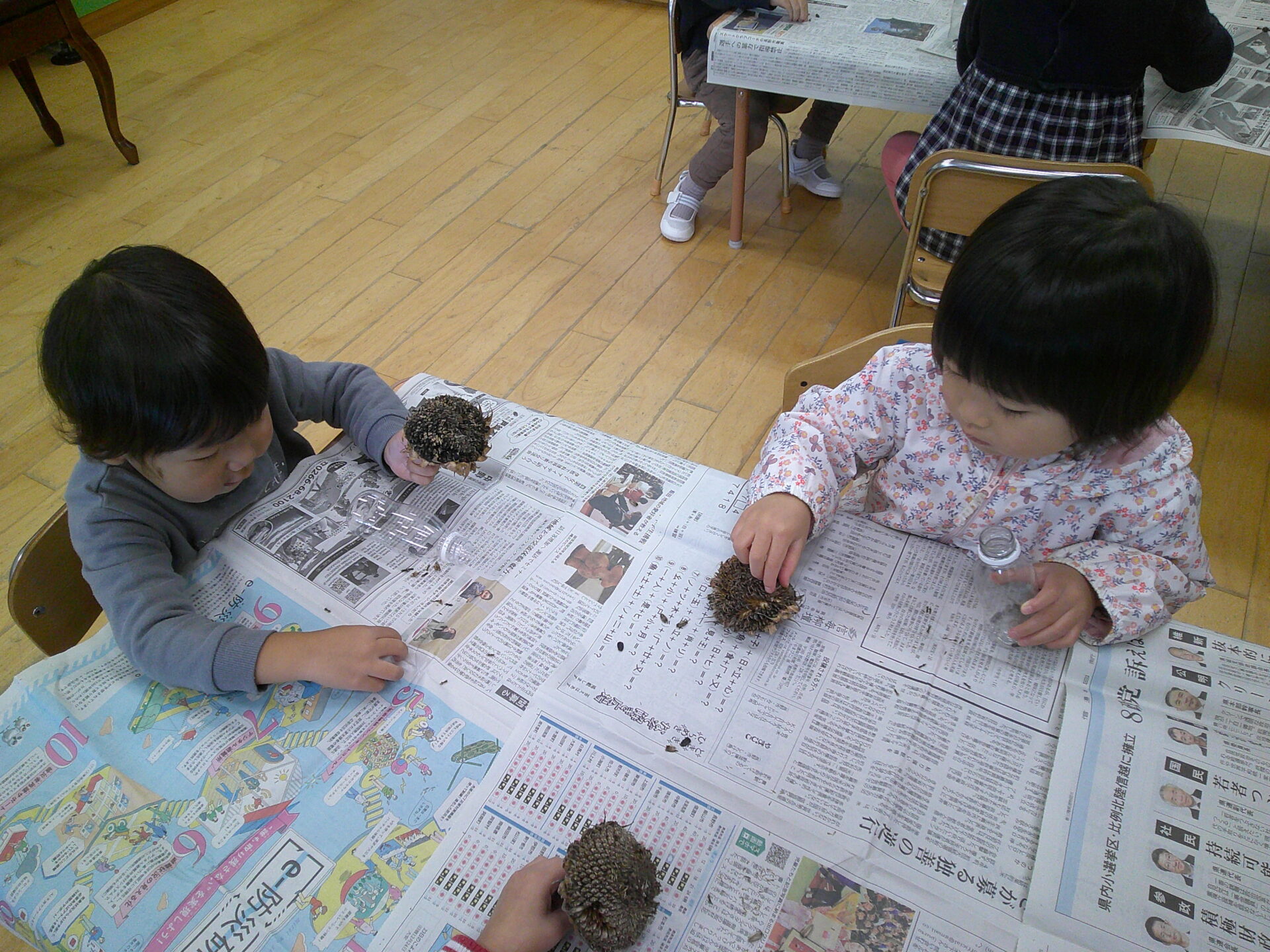 ひまわりの花から種を取り出すのがなかなか大変で、一つづつ取り出す子もいれば