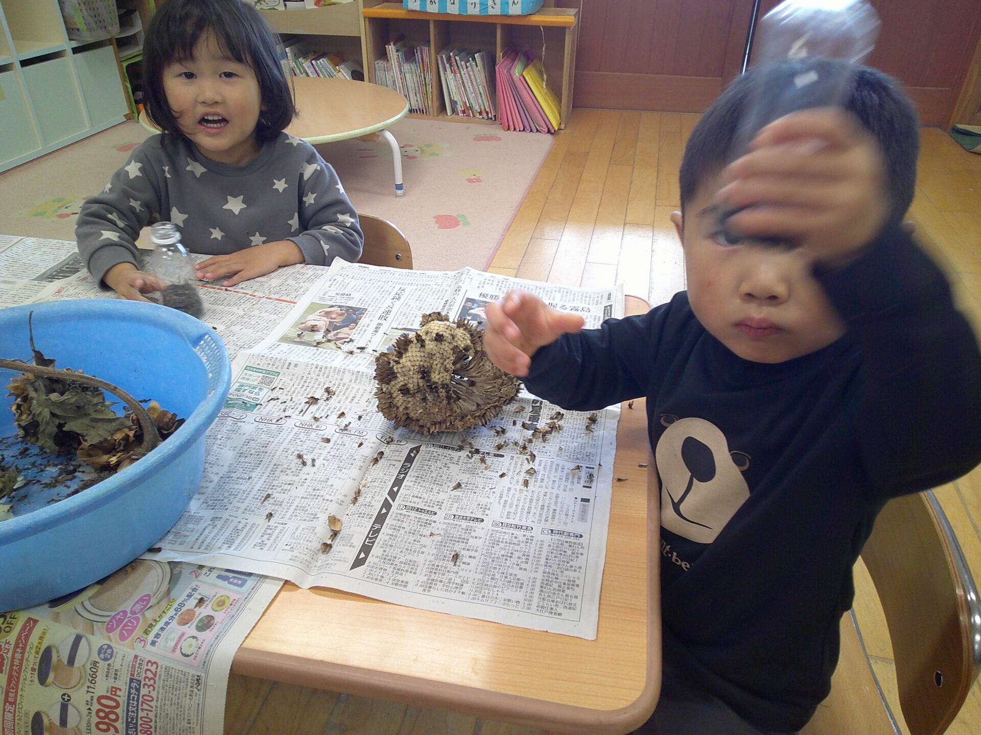 「おにわにあったひまわり!」と喜んで観察したり、早速種を取り出し始めたりしていました。