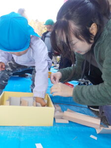 日頃自分達が遊んでいる場をおうちの方に教えられることが、こども達にとっては自慢気でうれしい様子が伝わってきた。また、おうちの方が一緒に制作してくださり、自分達だけでは難しいところもでき、満足できたように思う。