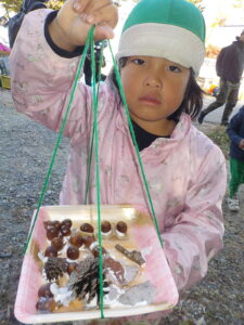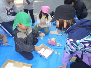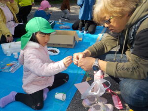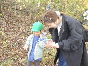 土曜参観日で日頃自分達が遊んでいる場所へおうちの人と一緒に出かけて、自然物を探したり、拾ったもので制作を楽しみました。