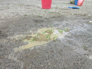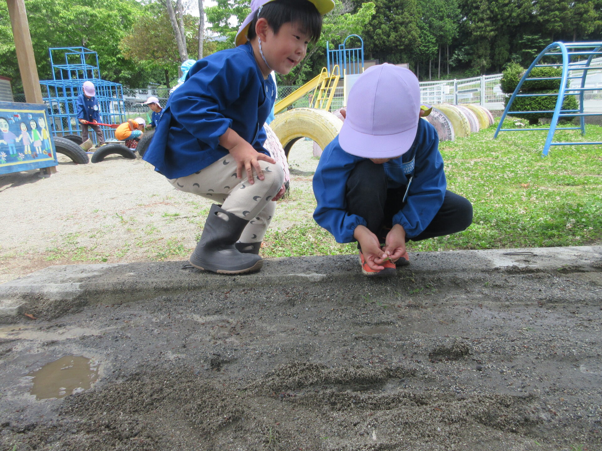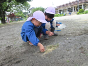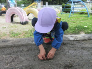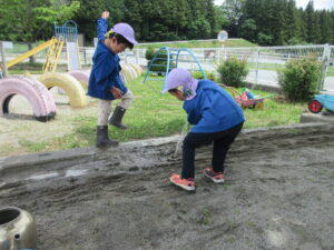 ・毎年この時期になるとこの遊びを始める子どもたち。土や水がどんな風に変わるのか観察することで、自然環境への興味や関心をもつきっかけになるといいな〜と思います。ちょうどお米不足が社会的に問題となっていた時期だったので、そのことを伝えるとより一層張り切っていました!