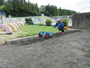 園庭のなにもないところで突然田んぼ作りが始まりました。手押し車が耕運機に変身です!