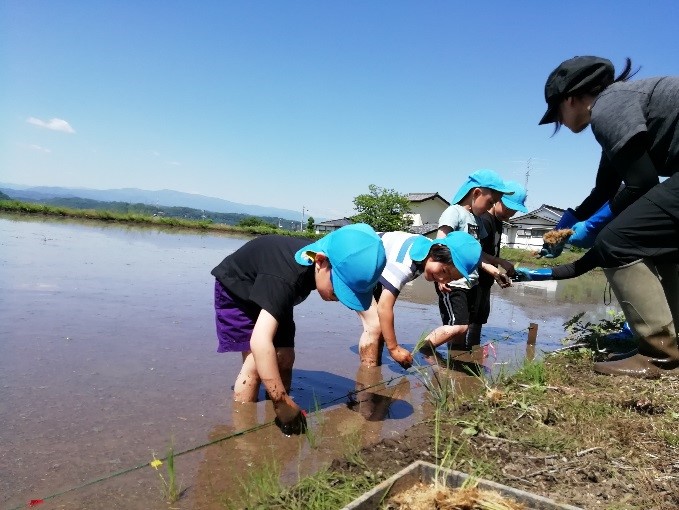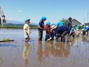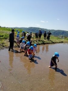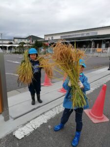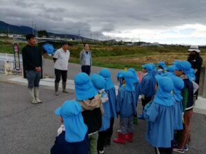 滋野地区では小学校でも米作りの体験をしています。佐藤さんからは「また小学校でも一緒にお米作りをしましょう」、「感謝の気持ちが伝わってきてうれしかったです」と感想をいただきました。保育園で学んだことが就学後の体験活動へ活かされることを願っています。
