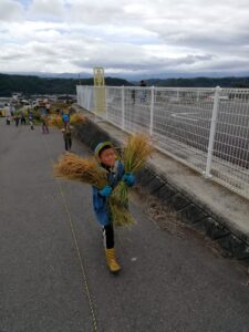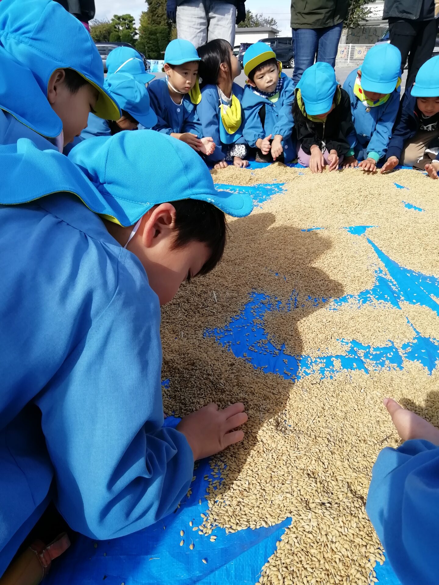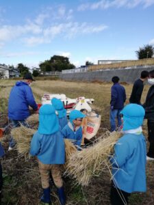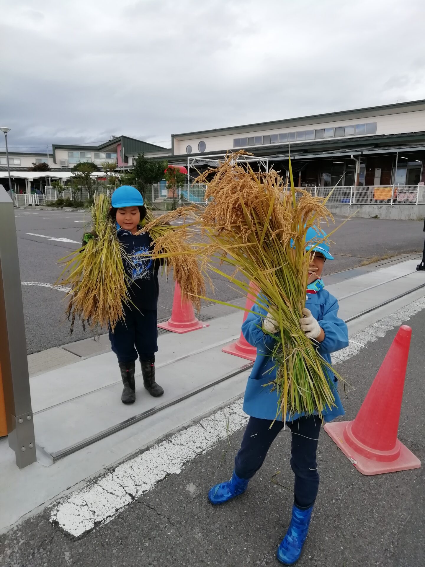 「稲って重いね」と稲穂が束になった重さを言葉にしたり、「頑張って運ぼう!」と友だち同士声を掛け合い協力しあう姿が見られました。何度も往復し全ての稲を運び終わると「つかれた~」とへとへとなこどもたち。