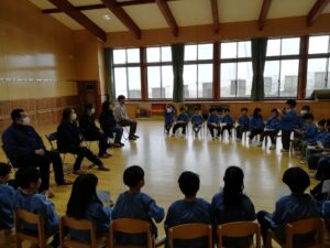収穫したお米を「佐藤さんと一緒に食べたい」という思いから、1月16日に佐藤さんを保育園に招待し、収穫祭を行いました。佐藤さんへ感謝の思いを伝えるために、歌やダンスを発表したり、米作りの思い出を絵に描き、体験して楽しかったことや大変だと感じたことを一人ずつ言葉にして佐藤さんへ伝えました。