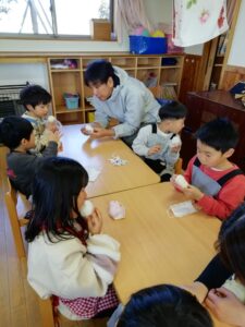 脱穀されたお米をみんなで観察してみると、「このお米もう食べられるのかな?」「どうやって白いお米になるんだろう?」と沢山の疑問がうまれました。そこで佐藤さんがお米の人形を使い、「もみすり」や「精米」という過程があることを教えてくれました。お米を食べるまでにはたくさんの仕事がある事を学んだこどもたちでした。