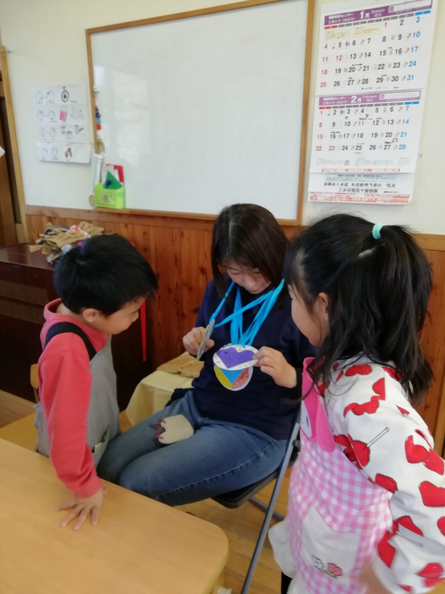 最後に感謝の思いを書いたメダルを一人ずつ首に掛け、米袋で作ったバッグとお米作りの絵が描いてあるカレンダーをプレゼントしました。喜んでくれている佐藤さんの姿を見てとても嬉しそうな子どもたちでした。