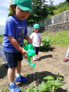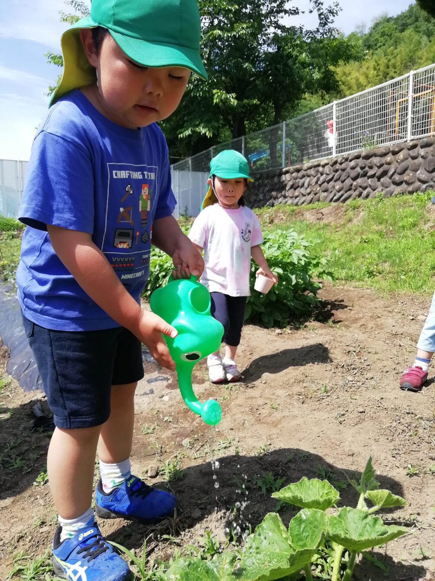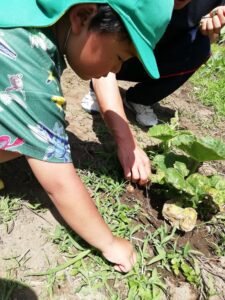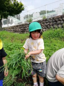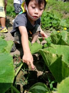 かぼちゃのツルや葉もぐんぐん成長、それと同時に周りの草もものすごい勢いで伸びています。みんなでせっせと草を抜いていたら、