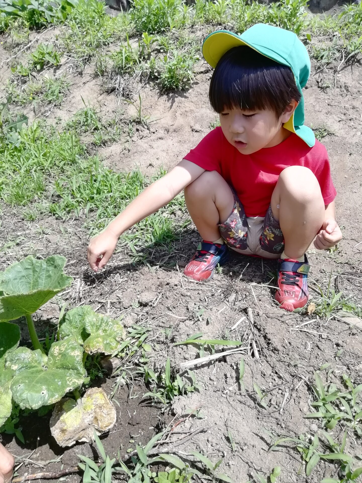 かぼちゃに水が行き渡るよう、草取りをしていたら、小さな実がついているのを見つけたよ。