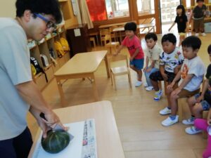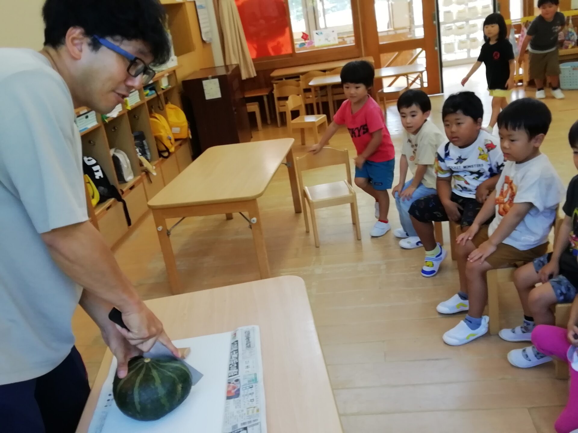 かぼちゃに包丁を入れる保育士。かぼちゃは固く、ぐっと力を込めて縦に切ります。その姿をじっと見つめ、見守る子ども達です。